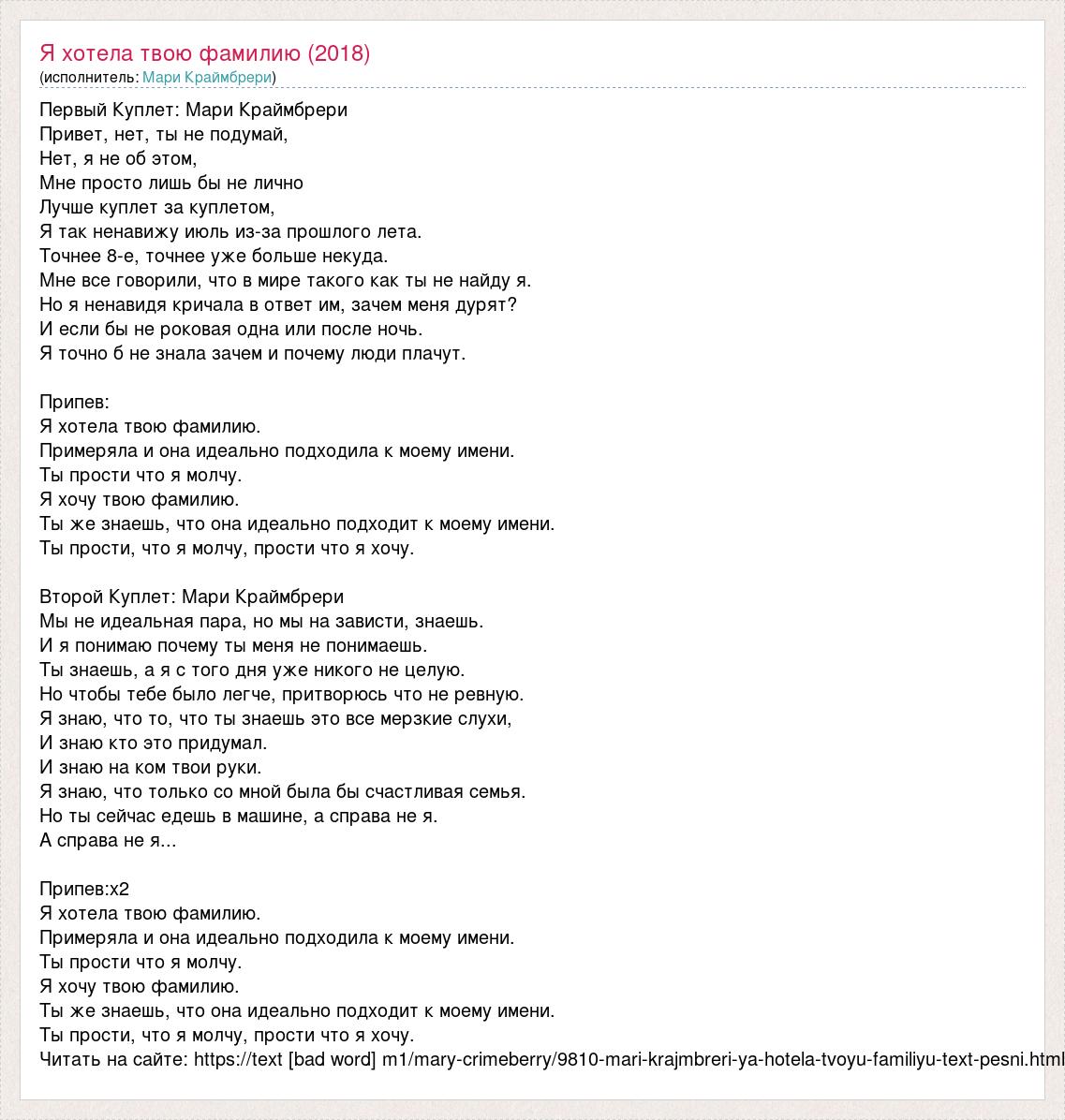 Первый Куплет: Мари Краймбрери Привет, нет, ты не подумай, Нет, я не об этом, Мне просто лишь бы не лично Лучше куплет за куплетом, Я так ненавижу июль из-за прошлого лета. Точнее 8-е, точнее уже больше некуда. Мне все говорили, что в мире такого как ты не найду я. Но я ненавидя кричала в ответ им, зачем меня дурят? И если бы не роковая одна или после ночь. Я точно б не знала зачем и почему люди плачут. Припев: Я хотела твою фамилию. Примеряла и она идеально подходила к моему имени. Ты прости что я молчу. Я хочу твою фамилию. Ты же знаешь, что она идеально подходит к моему имени. Ты прости, что я молчу, прости что я хочу. Второй Куплет: Мари Краймбрери Мы не идеальная пара, но мы на зависти, знаешь. И я понимаю почему ты меня не понимаешь. Ты знаешь, а я с того дня уже никого не целую. Но чтобы тебе было легче, притворюсь что не ревную. Я знаю, что то, что ты знаешь это все мерзкие слухи, И знаю кто это придумал. И знаю на ком твои руки. Я знаю, что только со мной была бы счастливая семья. Но ты сейчас едешь в машине, а справа не я. А справа не я... Припев:х2 Я хотела твою фамилию. Примеряла и она идеально подходила к моему имени. Ты прости что я молчу. Я хочу твою фамилию. Ты же знаешь, что она идеально подходит к моему имени. Ты прости, что я молчу, прости что я хочу. Читать на сайте: https://text [bad word] m1/mary-crimeberry/9810-mari-krajmbreri-ya-hotela-tvoyu-familiyu-text-pesni.html