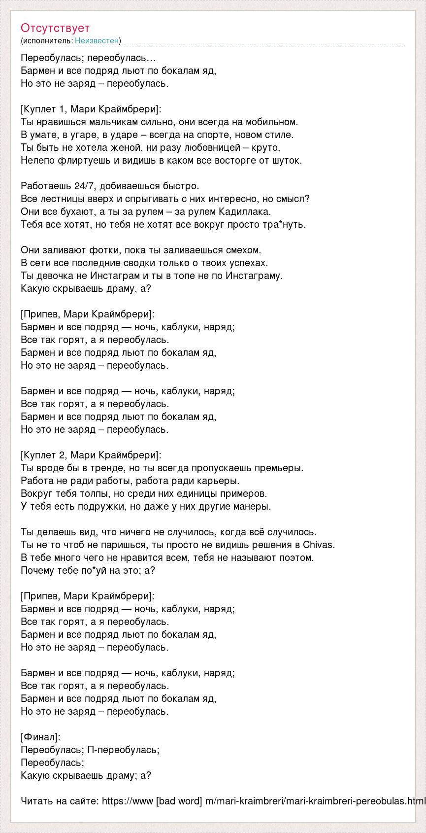 Переобулась; переобулась… Бармен и все подряд льют по бокалам яд, Но это не заряд – переобулась. [Куплет 1, Мари Краймбрери]: Ты нравишься мальчикам сильно, они всегда на мобильном. В умате, в угаре, в ударе – всегда на спорте, новом стиле. Ты быть не хотела женой, ни разу любовницей – круто. Нелепо флиртуешь и видишь в каком все восторге от шуток. Работаешь 24/7, добиваешься быстро. Все лестницы вверх и спрыгивать с них интересно, но смысл? Они все бухают, а ты за рулем – за рулем Кадиллака. Тебя все хотят, но тебя не хотят все вокруг просто тра*нуть. Они заливают фотки, пока ты заливаешься смехом. В сети все последние сводки только о твоих успехах. Ты девочка не Инстаграм и ты в топе не по Инстаграму. Какую скрываешь драму, а? [Припев, Мари Краймбрери]: Бармен и все подряд — ночь, каблуки, наряд; Все так горят, а я переобулась. Бармен и все подряд льют по бокалам яд, Но это не заряд – переобулась. Бармен и все подряд — ночь, каблуки, наряд; Все так горят, а я переобулась. Бармен и все подряд льют по бокалам яд, Но это не заряд – переобулась. [Куплет 2, Мари Краймбрери]: Ты вроде бы в тренде, но ты всегда пропускаешь премьеры. Работа не ради работы, работа ради карьеры. Вокруг тебя толпы, но среди них единицы примеров. У тебя есть подружки, но даже у них другие манеры. Ты делаешь вид, что ничего не случилось, когда всё случилось. Ты не то чтоб не паришься, ты просто не видишь решения в Chivas. В тебе много чего не нравится всем, тебя не называют поэтом. Почему тебе по*уй на это; а? [Припев, Мари Краймбрери]: Бармен и все подряд — ночь, каблуки, наряд; Все так горят, а я переобулась. Бармен и все подряд льют по бокалам яд, Но это не заряд – переобулась. Бармен и все подряд — ночь, каблуки, наряд; Все так горят, а я переобулась. Бармен и все подряд льют по бокалам яд, Но это не заряд – переобулась. [Финал]: Переобулась; П-переобулась; Переобулась; Какую скрываешь драму; а? Читать на сайте: https://www [bad word] m/mari-kraimbreri/mari-kraimbreri-pereobulas.html