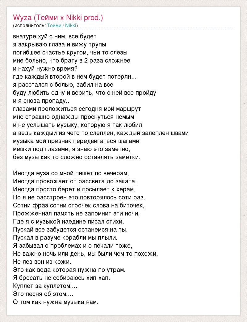 внатуре хуй с ним, все будет я закрываю глаза и вижу трупы погибшее счастье кругом, чьи то слезы мне больно, что брату в 2 раза сложнее и нахуй нужно время? где каждый второй в нем будет потерян... я расстался с болью, забил на все буду любить одну и верить, что с ней все пройду и я снова пропаду.. глазами проложиться сегодня мой маршрут мне страшно однажды проснуться немым и не услышать музыку, которую я так любил а ведь каждый из чего то слеплен, каждый залеплен швами музыка мой признак передвигаться шагами мешки под глазами, я знаю это заметно, без музы как то сложно оставлять заметки. Иногда муза со мной пишет по вечерам, Иногда провожает от рассвета до заката, Иногда просто берет и посылает к херам, Но я не расстроен это повторялось соти раз. Сотни фраз сотни строчек слова на биточек, Прожженная память не запомнит эти ночи, Где я с музыкой наедине писал стихи, Пускай все забудется останемся на ты. Пускал в разуме корабли мы плыли. Я забывал о проблемах и о печали тоже, Не важно ночь или день, мы были чем то похожи, Не лез вон из кожи. Это как вода которая нужна по утрам. Я бросать не собираюсь хип-хап. Куплет за куплетом.... Это песня об этом.... О том как нужна музыка нам.