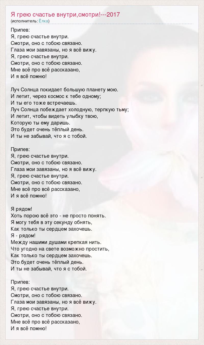 Припев: Я, грею счастье внутри. Смотри, оно с тобою связано. Глаза мои завязаны, но я всё вижу. Я, грею счастье внутри. Смотри, оно с тобою связано. Мне всё про всё рассказано, И я всё помню! Луч Солнца покидает большую планету мою. И летит, через космос к тебе одному; И ты его тоже встречаешь. Луч Солнца побеждает холодную, терпкую тьму; И летит, чтобы видеть улыбку твою, Которую ты ему даришь. Это будет очень тёплый день. И ты не забывай, что я с тобой. Припев: Я, грею счастье внутри. Смотри, оно с тобою связано. Глаза мои завязаны, но я всё вижу. Я, грею счастье внутри. Смотри, оно с тобою связано. Мне всё про всё рассказано, И я всё помню! Я рядом! Хоть порою всё это - не просто понять. Я могу тебя в эту секунду обнять, Как только ты сердцем захочешь. Я - рядом! Между нашими душами крепкая нить. Что угодно на свете возможно простить, Как только ты сердцем захочешь. Это будет очень тёплый день. И ты не забывай, что я с тобой. Припев: Я, грею счастье внутри. Смотри, оно с тобою связано. Глаза мои завязаны, но я всё вижу. Я, грею счастье внутри. Смотри, оно с тобою связано. Мне всё про всё рассказано, И я всё помню!