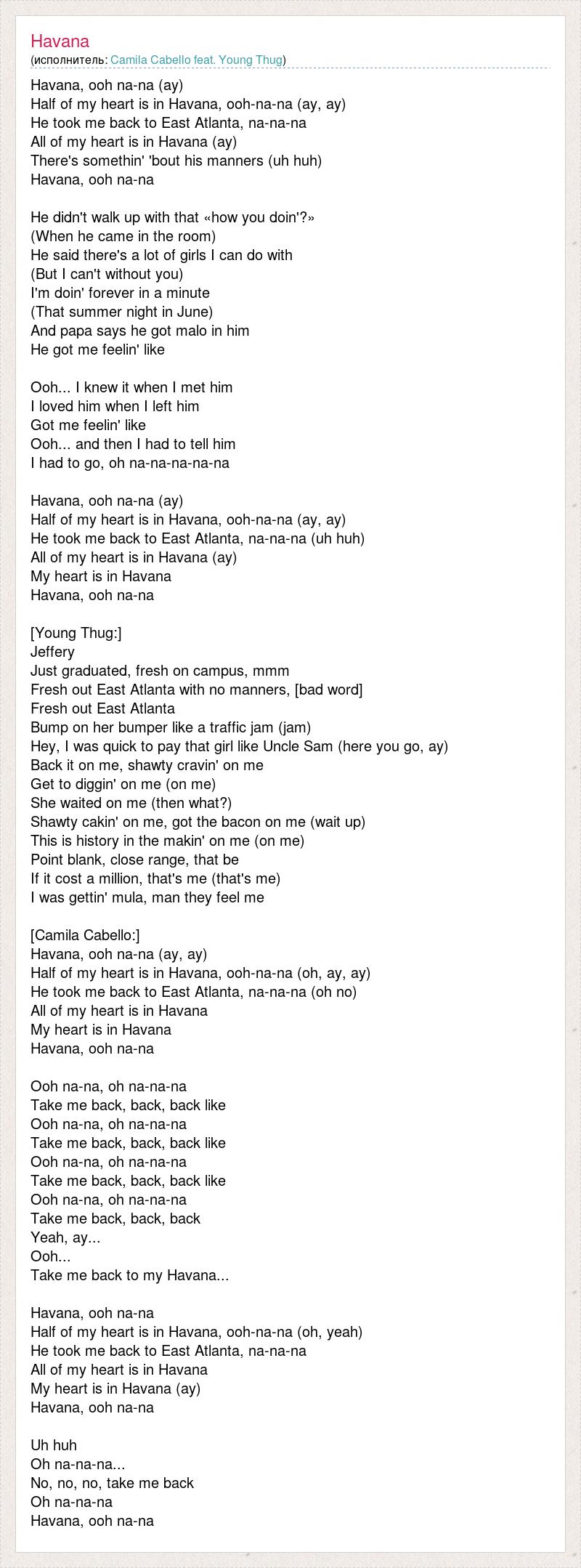 Havana, ooh na-na (ay) Half of my heart is in Havana, ooh-na-na (ay, ay) He took me back to East Atlanta, na-na-na All of my heart is in Havana (ay) There's somethin' 'bout his manners (uh huh) Havana, ooh na-na He didn't walk up with that «how you doin'?» (When he came in the room) He said there's a lot of girls I can do with (But I can't without you) I'm doin' forever in a minute (That summer night in June) And papa says he got malo in him He got me feelin' like Ooh... I knew it when I met him I loved him when I left him Got me feelin' like Ooh... and then I had to tell him I had to go, oh na-na-na-na-na Havana, ooh na-na (ay) Half of my heart is in Havana, ooh-na-na (ay, ay) He took me back to East Atlanta, na-na-na (uh huh) All of my heart is in Havana (ay) My heart is in Havana Havana, ooh na-na [Young Thug:] Jeffery Just graduated, fresh on campus, mmm Fresh out East Atlanta with no manners, [bad word] Fresh out East Atlanta Bump on her bumper like a traffic jam (jam) Hey, I was quick to pay that girl like Uncle Sam (here you go, ay) Back it on me, shawty cravin' on me Get to diggin' on me (on me) She waited on me (then what?) Shawty cakin' on me, got the bacon on me (wait up) This is history in the makin' on me (on me) Point blank, close range, that be If it cost a million, that's me (that's me) I was gettin' mula, man they feel me [Camila Cabello:] Havana, ooh na-na (ay, ay) Half of my heart is in Havana, ooh-na-na (oh, ay, ay) He took me back to East Atlanta, na-na-na (oh no) All of my heart is in Havana My heart is in Havana Havana, ooh na-na Ooh na-na, oh na-na-na Take me back, back, back like Ooh na-na, oh na-na-na Take me back, back, back like Ooh na-na, oh na-na-na Take me back, back, back like Ooh na-na, oh na-na-na Take me back, back, back Yeah, ay... Ooh... Take me back to my Havana... Havana, ooh na-na Half of my heart is in Havana, ooh-na-na (oh, yeah) He took me back to East Atlanta, na-na-na All of my heart is in Havana My heart is in Havana (ay) Havana, ooh na-na Uh huh Oh na-na-na... No, no, no, take me back Oh na-na-na Havana, ooh na-na