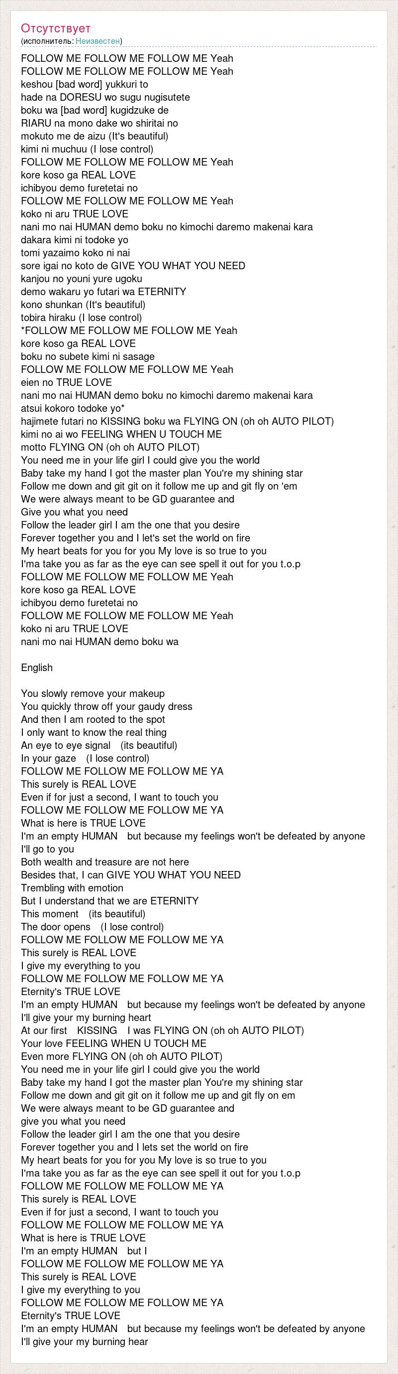 FOLLOW ME FOLLOW ME FOLLOW ME Yeah FOLLOW ME FOLLOW ME FOLLOW ME Yeah keshou [bad word] yukkuri to hade na DORESU wo sugu nugisutete boku wa [bad word] kugidzuke de RIARU na mono dake wo shiritai no mokuto me de aizu (It's beautiful) kimi ni muchuu (I lose control) FOLLOW ME FOLLOW ME FOLLOW ME Yeah kore koso ga REAL LOVE ichibyou demo furetetai no FOLLOW ME FOLLOW ME FOLLOW ME Yeah koko ni aru TRUE LOVE nani mo nai HUMAN demo boku no kimochi daremo makenai kara dakara kimi ni todoke yo tomi yazaimo koko ni nai sore igai no koto de GIVE YOU WHAT YOU NEED kanjou no youni yure ugoku demo wakaru yo futari wa ETERNITY kono shunkan (It's beautiful) tobira hiraku (I lose control) *FOLLOW ME FOLLOW ME FOLLOW ME Yeah kore koso ga REAL LOVE boku no subete kimi ni sasage FOLLOW ME FOLLOW ME FOLLOW ME Yeah eien no TRUE LOVE nani mo nai HUMAN demo boku no kimochi daremo makenai kara atsui kokoro todoke yo* hajimete futari no KISSING boku wa FLYING ON (oh oh AUTO PILOT) kimi no ai wo FEELING WHEN U TOUCH ME motto FLYING ON (oh oh AUTO PILOT) You need me in your life girl I could give you the world Baby take my hand I got the master plan You're my shining star Follow me down and git git on it follow me up and git fly on 'em We were always meant to be GD guarantee and Give you what you need Follow the leader girl I am the one that you desire Forever together you and I let's set the world on fire My heart beats for you for you My love is so true to you I'ma take you as far as the eye can see spell it out for you t.o.p FOLLOW ME FOLLOW ME FOLLOW ME Yeah kore koso ga REAL LOVE ichibyou demo furetetai no FOLLOW ME FOLLOW ME FOLLOW ME Yeah koko ni aru TRUE LOVE nani mo nai HUMAN demo boku wa English You slowly remove your makeup You quickly throw off your gaudy dress And then I am rooted to the spot I only want to know the real thing An eye to eye signal (its beautiful) In your gaze (I lose control) FOLLOW ME FOLLOW ME FOLLOW ME YA This surely is REAL LOVE Even if for just a second, I want to touch you FOLLOW ME FOLLOW ME FOLLOW ME YA What is here is TRUE LOVE I'm an empty HUMAN but because my feelings won't be defeated by anyone I'll go to you Both wealth and treasure are not here Besides that, I can GIVE YOU WHAT YOU NEED Trembling with emotion But I understand that we are ETERNITY This moment (its beautiful) The door opens (I lose control) FOLLOW ME FOLLOW ME FOLLOW ME YA This surely is REAL LOVE I give my everything to you FOLLOW ME FOLLOW ME FOLLOW ME YA Eternity's TRUE LOVE I'm an empty HUMAN but because my feelings won't be defeated by anyone I'll give your my burning heart At our first KISSING I was FLYING ON (oh oh AUTO PILOT) Your love FEELING WHEN U TOUCH ME Even more FLYING ON (oh oh AUTO PILOT) You need me in your life girl I could give you the world Baby take my hand I got the master plan You're my shining star Follow me down and git git on it follow me up and git fly on em We were always meant to be GD guarantee and give you what you need Follow the leader girl I am the one that you desire Forever together you and I lets set the world on fire My heart beats for you for you My love is so true to you I'ma take you as far as the eye can see spell it out for you t.o.p FOLLOW ME FOLLOW ME FOLLOW ME YA This surely is REAL LOVE Even if for just a second, I want to touch you FOLLOW ME FOLLOW ME FOLLOW ME YA What is here is TRUE LOVE I'm an empty HUMAN but I FOLLOW ME FOLLOW ME FOLLOW ME YA This surely is REAL LOVE I give my everything to you FOLLOW ME FOLLOW ME FOLLOW ME YA Eternity's TRUE LOVE I'm an empty HUMAN but because my feelings won't be defeated by anyone I'll give your my burning hear