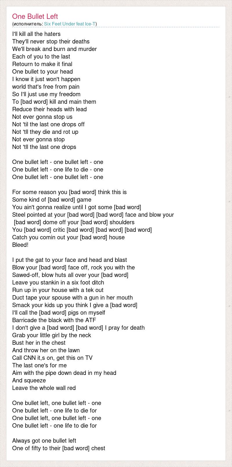 I'll kill all the haters They'll never stop their deaths We'll break and burn and murder Each of you to the last Retourn to make it final One bullet to your head I know it just won't happen world that's free from pain So I'll just use my freedom To [bad word] kill and main them Reduce their heads with lead Not ever gonna stop us Not 'til the last one drops off Not 'tll they die and rot up Not ever gonna stop Not 'tll the last one drops One bullet left - one bullet left - one One bullet left - one life to die - one One bullet left - one bullet left - one For some reason you [bad word] think this is Some kind of [bad word] game You ain't gonna realize until I got some [bad word] Steel pointed at your [bad word] [bad word] face and blow your [bad word] dome off your [bad word] shoulders You [bad word] critic [bad word] [bad word] [bad word] Catch you comin out your [bad word] house Bleed! I put the gat to your face and head and blast Blow your [bad word] face off, rock you with the Sawed-off, blow huts all over your [bad word] Leave you stankin in a six foot ditch Run up in your house with a tek out Duct tape your spouse with a gun in her mouth Smack your kids up you think I give a [bad word] I'll call the [bad word] pigs on myself Barricade the black with the ATF I don't give a [bad word] [bad word] I pray for death Grab your little girl by the neck Bust her in the chest And throw her on the lawn Call CNN it,s on, get this on TV The last one's for me Aim with the pipe down dead in my head And squeeze Leave the whole wall red One bullet left, one bullet left - one One bullet left - one life to die for One bullet left, one bullet left - one One bullet left - one life to die for Always got one bullet left One of fifty to their [bad word] chest
