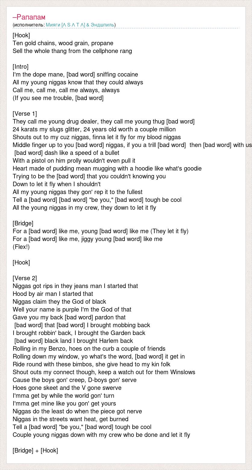 [Hook] Ten gold chains, wood grain, propane Sell the whole thang from the cellphone rang [Intro] I'm the dope mane, [bad word] sniffing cocaine All my young niggas know that they could always Call me, call me, call me always, always (If you see me trouble, [bad word] [Verse 1] They call me young drug dealer, they call me young thug [bad word] 24 karats my slugs glitter, 24 years old worth a couple million Shouts out to my cuz niggas, finna let it fly for my blood niggas Middle finger up to you [bad word] niggas, if you a trill [bad word] then [bad word] with us [bad word] dash like a speed of a bullet With a pistol on him prolly wouldn't even pull it Heart made of pudding mean mugging with a hoodie like what's goodie Trying to be the [bad word] that you couldn't knowing you Down to let it fly when I shouldn't All my young niggas they gon' rep it to the fullest Tell a [bad word] [bad word] "be you," [bad word] tough be cool All the young niggas in my crew, they down to let it fly [Bridge] For a [bad word] like me, young [bad word] like me (They let it fly) For a [bad word] like me, jiggy young [bad word] like me (Flex!) [Hook] [Verse 2] Niggas got rips in they jeans man I started that Hood by air man I started that Niggas claim they the God of black Well your name is purple I'm the God of that Gave you my back [bad word] pardon that [bad word] that [bad word] I brought mobbing back I brought robbin' back, I brought the Garden back [bad word] black land I brought Harlem back Rolling in my Benzo, hoes on the curb a couple of friends Rolling down my window, yo what's the word, [bad word] it get in Ride round with these bimbos, she give head to my kin folk Shout outs my connect though, keep a watch out for them Winslows Cause the boys gon' creep, D-boys gon' serve Hoes gone skeet and the V gone swerve I'mma get by while the world gon' turn I'mma get mine like you gon' get yours Niggas do the least do when the piece got nerve Niggas in the streets want heat, get burned Tell a [bad word] "be you," [bad word] tough be cool Couple young niggas down with my crew who be done and let it fly [Bridge] + [Hook]