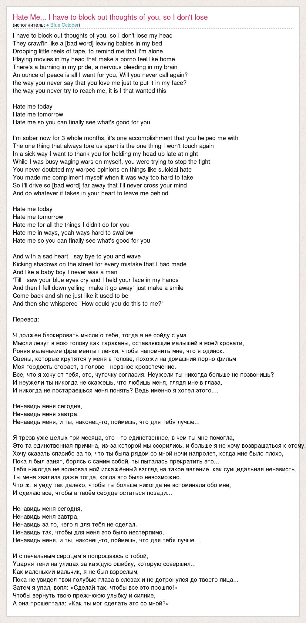 I have to block out thoughts of you, so I don't lose my head They crawl'in like a [bad word] leaving babies in my bed Dropping little reels of tape, to remind me that I'm alone Playing movies in my head that make a porno feel like home There's a burning in my pride, a nervous bleeding in my brain An ounce of peace is all I want for you, Will you never call again? the way you never say that you love me just to put it in my face? the way you never try to reach me, it is I that wanted this Hate me today Hate me tomorrow Hate me so you can finally see what's good for you I'm sober now for 3 whole months, it's one accomplishment that you helped me with The one thing that always tore us apart is the one thing I won't touch again In a sick way I want to thank you for holding my head up late at night While I was busy waging wars on myself, you were trying to stop the fight You never doubted my warped opinions on things like suicidal hate You made me compliment myself when it was way too hard to take So I'll drive so [bad word] far away that I'll never cross your mind And do whatever it takes in your heart to leave me behind Hate me today Hate me tomorrow Hate me for all the things I didn't do for you Hate me in ways, yeah ways hard to swallow Hate me so you can finally see what's good for you And with a sad heart I say bye to you and wave Kicking shadows on the street for every mistake that I had made And like a baby boy I never was a man 'Till I saw your blue eyes cry and I held your face in my hands And then I fell down yelling "make it go away" just make a smile Come back and shine just like it used to be And then she whispered "How could you do this to me?" Перевод: Я должен блокировать мысли о тебе, тогда я не сойду с ума. Мысли лезут в мою голову как тараканы, оставляющие малышей в моей кровати, Роняя маленькие фрагменты пленки, чтобы напомнить мне, что я одинок. Сцены, которые крутятся у меня в голове, похожи на домашний порно фильм Моя гордость сгорает, в голове - нервное кровотечение. Все, что я хочу от тебя, это, чуточку согласия. Неужели ты никогда больше не позвонишь? И неужели ты никогда не скажешь, что любишь меня, глядя мне в глаза, И никогда не постараешься меня понять? Ведь именно я хотел этого.... Ненавидь меня сегодня, Ненавидь меня завтра, Ненавидь меня, и ты, наконец-то, поймешь, что для тебя лучше... Я трезв уже целых три месяца, это - то единственное, в чем ты мне помогла, Это та единственная причина, из-за которой мы ссорились, и больше я не хочу возвращаться к этому. Хочу сказать спасибо за то, что ты была рядом со мной ночи напролет, когда мне было плохо, Пока я был занят, борясь с самим собой, ты пыталась прекратить это... Тебя никогда не волновал мой искажённый взгляд на такое явление, как суицидальная ненависть, Ты меня хвалила даже тогда, когда это было невозможно. Что ж, я уеду так далеко, чтобы ты больше никогда не вспоминала обо мне, И сделаю все, чтобы в твоём сердце остаться позади... Ненавидь меня сегодня, Ненавидь меня завтра, Ненавидь за то, чего я для тебя не сделал. Ненавидь так, чтобы для меня это было нестерпимо, Ненавидь меня, и ты, наконец-то, поймешь, что для тебя лучше... И с печальным сердцем я попрощаюсь с тобой, Ударяя тени на улицах за каждую ошибку, которую совершил... Как маленький мальчик, я не был взрослым, Пока не увидел твои голубые глаза в слезах и не дотронулся до твоего лица... Затем я упал, вопя: «Сделай так, чтобы все это прошло!» Чтобы вернуть твою прежнююю улыбку и сияние, А она прошептала: «Как ты мог сделать это со мной?»