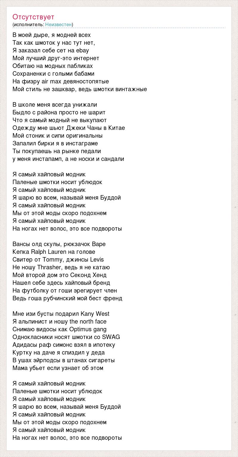 В моей дыре, я модней всех Так как шмоток у нас тут нет, Я заказал себе сет на ebay Мой лучший друг-это интернет Обитаю на модных пабликах Сохраненки с голыми бабами На физру air max девяностопятые Мой стиль не зашквар, ведь шмотки винтажные В школе меня всегда унижали Быдло с района просто не шарит Что я самый модный не выкупают Одежду мне шьют Джеки Чаны в Китае Мой стоник и сипи оригинальны Запалил бирки я в инстаграме Ты покупаешь на рынке педали у меня инстапамп, а не носки и сандали Я самый хайповый модник Паленые шмотки носит ублюдок Я самый хайповый модник Я шарю во всем, называй меня Буддой Я самый хайповый модник Мы от этой моды скоро подохнем Я самый хайповый модник На ногах нет волос, это все подвороты Вансы олд скулы, рюкзачок Bape Кепка Ralph Lauren на голове Свитер от Tommy, джинсы Levis Не ношу Thrasher, ведь я не катаю Мой второй дом это Секонд Хенд Нашел себе здесь хайповый бренд На футболку от гоши эрегирует член Ведь гоша рубчинский мой бест френд Мне изи бусты подарил Kany West Я альпинист и ношу the north face Снимаю видосы как Optimus gang Однокласники носят шмотки со SWAG Адидасы раф симонс взял в ипотеку Куртку на даче я спиздил у деда В ушах эйрподсы в штанах сигареты Мама убьет если узнает об этом Я самый хайповый модник Паленые шмотки носит ублюдок Я самый хайповый модник Я шарю во всем, называй меня Буддой Я самый хайповый модник Мы от этой моды скоро подохнем Я самый хайповый модник На ногах нет волос, это все подвороты