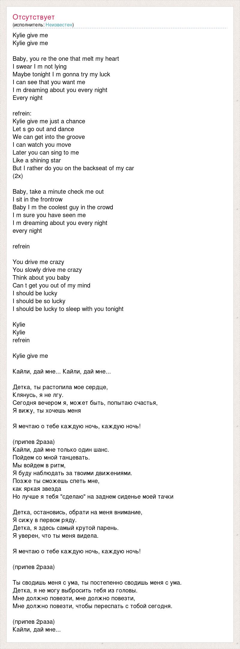Kylie give me Kylie give me Baby, you re the one that melt my heart I swear I m not lying Maybe tonight I m gonna try my luck I can see that you want me I m dreaming about you every night Every night refrein: Kylie give me just a chance Let s go out and dance We can get into the groove I can watch you move Later you can sing to me Like a shining star But I rather do you on the backseat of my car (2x) Baby, take a minute check me out I sit in the frontrow Baby I m the coolest guy in the crowd I m sure you have seen me I m dreaming about you every night every night refrein You drive me crazy You slowly drive me crazy Think about you baby Can t get you out of my mind I should be lucky I should be so lucky I should be lucky to sleep with you tonight Kylie Kylie refrein Kylie give me Кайли, дай мне... Кайли, дай мне... Детка, ты растопила мое сердце, Клянусь, я не лгу. Сегодня вечером я, может быть, попытаю счастья, Я вижу, ты хочешь меня Я мечтаю о тебе каждую ночь, каждую ночь! (припев 2раза) Кайли, дай мне только один шанс. Пойдем со мной танцевать. Мы войдем в ритм, Я буду наблюдать за твоими движениями. Позже ты сможешь спеть мне, как яркая звезда Но лучше я тебя "сделаю" на заднем сиденье моей тачки Детка, остановись, обрати на меня внимание, Я сижу в первом ряду. Детка, я здесь самый крутой парень. Я уверен, что ты меня видела. Я мечтаю о тебе каждую ночь, каждую ночь! (припев 2раза) Ты сводишь меня с ума, ты постепенно сводишь меня с ума. Детка, я не могу выбросить тебя из головы. Мне должно повезти, мне должно повезти, Мне должно повезти, чтобы переспать с тобой сегодня. (припев 2раза) Кайли, дай мне...