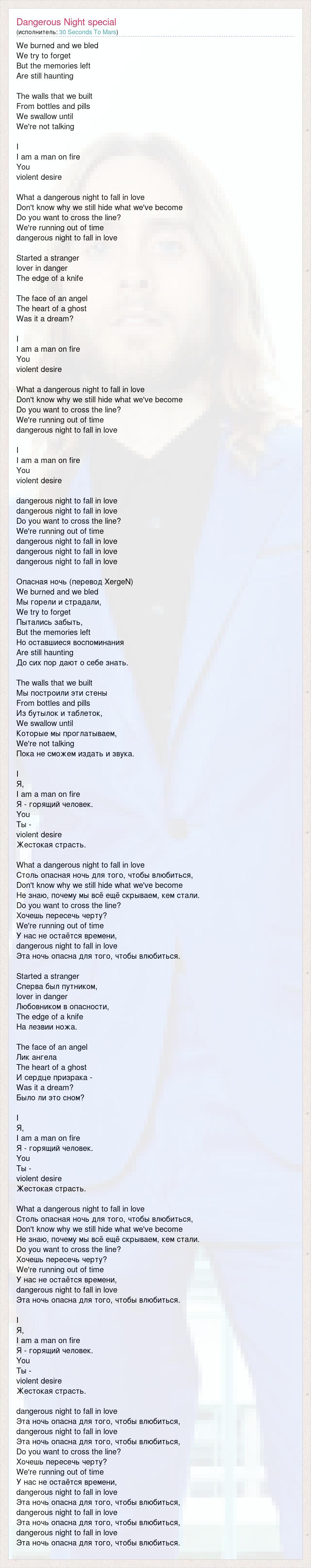 We burned and we bled We try to forget But the memories left Are still haunting The walls that we built From bottles and pills We swallow until We're not talking I I am a man on fire You violent desire What a dangerous night to fall in love Don't know why we still hide what we've become Do you want to cross the line? We're running out of time dangerous night to fall in love Started a stranger lover in danger The edge of a knife The face of an angel The heart of a ghost Was it a dream? I I am a man on fire You violent desire What a dangerous night to fall in love Don't know why we still hide what we've become Do you want to cross the line? We're running out of time dangerous night to fall in love I I am a man on fire You violent desire dangerous night to fall in love dangerous night to fall in love Do you want to cross the line? We're running out of time dangerous night to fall in love dangerous night to fall in love dangerous night to fall in love Опасная ночь (перевод XergeN) We burned and we bled Мы горели и страдали, We try to forget Пытались забыть, But the memories left Но оставшиеся воспоминания Are still haunting До сих пор дают о себе знать. The walls that we built Мы построили эти стены From bottles and pills Из бутылок и таблеток, We swallow until Которые мы проглатываем, We're not talking Пока не сможем издать и звука. I Я, I am a man on fire Я - горящий человек. You Ты - violent desire Жестокая страсть. What a dangerous night to fall in love Столь опасная ночь для того, чтобы влюбиться, Don't know why we still hide what we've become Не знаю, почему мы всё ещё скрываем, кем стали. Do you want to cross the line? Хочешь пересечь черту? We're running out of time У нас не остаётся времени, dangerous night to fall in love Эта ночь опасна для того, чтобы влюбиться. Started a stranger Сперва был путником, lover in danger Любовником в опасности, The edge of a knife На лезвии ножа. The face of an angel Лик ангела The heart of a ghost И сердце призрака - Was it a dream? Было ли это сном? I Я, I am a man on fire Я - горящий человек. You Ты - violent desire Жестокая страсть. What a dangerous night to fall in love Столь опасная ночь для того, чтобы влюбиться, Don't know why we still hide what we've become Не знаю, почему мы всё ещё скрываем, кем стали. Do you want to cross the line? Хочешь пересечь черту? We're running out of time У нас не остаётся времени, dangerous night to fall in love Эта ночь опасна для того, чтобы влюбиться. I Я, I am a man on fire Я - горящий человек. You Ты - violent desire Жестокая страсть. dangerous night to fall in love Эта ночь опасна для того, чтобы влюбиться, dangerous night to fall in love Эта ночь опасна для того, чтобы влюбиться, Do you want to cross the line? Хочешь пересечь черту? We're running out of time У нас не остаётся времени, dangerous night to fall in love Эта ночь опасна для того, чтобы влюбиться, dangerous night to fall in love Эта ночь опасна для того, чтобы влюбиться, dangerous night to fall in love Эта ночь опасна для того, чтобы влюбиться.