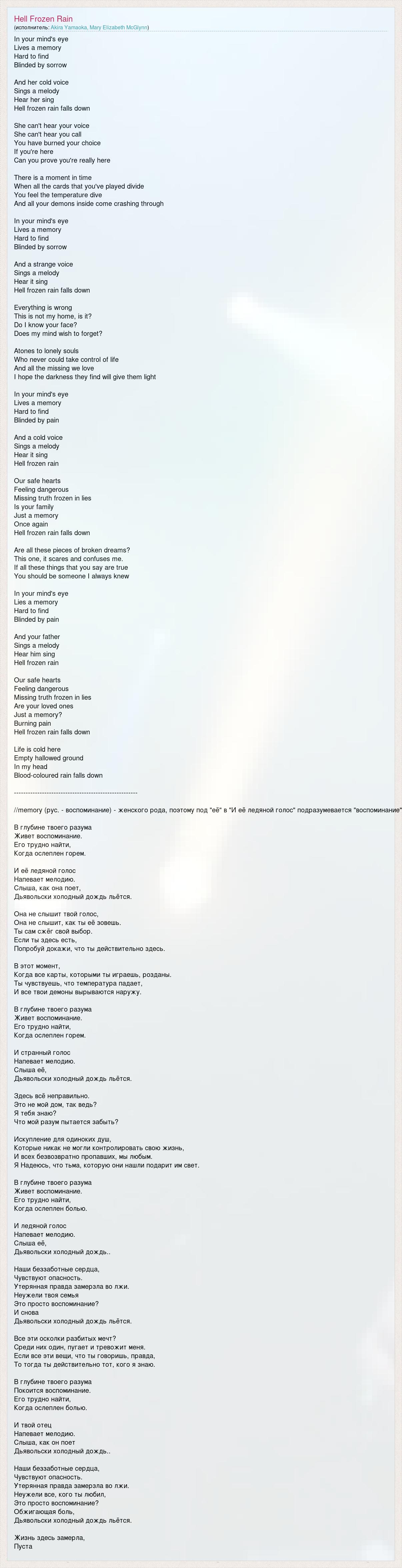 In your mind's eye Lives a memory Hard to find Blinded by sorrow And her cold voice Sings a melody Hear her sing Hell frozen rain falls down She can't hear your voice She can't hear you call You have burned your choice If you're here Can you prove you're really here There is a moment in time When all the cards that you've played divide You feel the temperature dive And all your demons inside come crashing through In your mind's eye Lives a memory Hard to find Blinded by sorrow And a strange voice Sings a melody Hear it sing Hell frozen rain falls down Everything is wrong This is not my home, is it? Do I know your face? Does my mind wish to forget? Atones to lonely souls Who never could take control of life And all the missing we love I hope the darkness they find will give them light In your mind's eye Lives a memory Hard to find Blinded by pain And a cold voice Sings a melody Hear it sing Hell frozen rain Our safe hearts Feeling dangerous Missing truth frozen in lies Is your family Just a memory Once again Hell frozen rain falls down Are all these pieces of broken dreams? This one, it scares and confuses me. If all these things that you say are true You should be someone I always knew In your mind's eye Lies a memory Hard to find Blinded by pain And your father Sings a melody Hear him sing Hell frozen rain Our safe hearts Feeling dangerous Missing truth frozen in lies Are your loved ones Just a memory? Burning pain Hell frozen rain falls down Life is cold here Empty hallowed ground In my head Blood-coloured rain falls down ----------------------------------------------------- //memory (рус. - воспоминание) - женского рода, поэтому под "её" в "И её ледяной голос" подразумевается "воспоминание" В глубине твоего разума Живет воспоминание. Его трудно найти, Когда ослеплен горем. И её ледяной голос Напевает мелодию. Слыша, как она поет, Дьявольски холодный дождь льётся. Она не слышит твой голос, Она не слышит, как ты её зовешь. Ты сам сжёг свой выбор. Если ты здесь есть, Попробуй докажи, что ты действительно здесь. В этот момент, Когда все карты, которыми ты играешь, розданы. Ты чувствуешь, что температура падает, И все твои демоны вырываются наружу. В глубине твоего разума Живет воспоминание. Его трудно найти, Когда ослеплен горем. И странный голос Напевает мелодию. Слыша её, Дьявольски холодный дождь льётся. Здесь всё неправильно. Это не мой дом, так ведь? Я тебя знаю? Что мой разум пытается забыть? Искупление для одиноких душ, Которые никак не могли контролировать свою жизнь, И всех безвозвратно пропавших, мы любым. Я Надеюсь, что тьма, которую они нашли подарит им свет. В глубине твоего разума Живет воспоминание. Его трудно найти, Когда ослеплен болью. И ледяной голос Напевает мелодию. Слыша её, Дьявольски холодный дождь.. Наши беззаботные сердца, Чувствуют опасность. Утерянная правда замерзла во лжи. Неужели твоя семья Это просто воспоминание? И снова Дьявольски холодный дождь льётся. Все эти осколки разбитых мечт? Среди них один, пугает и тревожит меня. Если все эти вещи, что ты говоришь, правда, То тогда ты действительно тот, кого я знаю. В глубине твоего разума Покоится воспоминание. Его трудно найти, Когда ослеплен болью. И твой отец Напевает мелодию. Слыша, как он поет Дьявольски холодный дождь.. Наши беззаботные сердца, Чувствуют опасность. Утерянная правда замерзла во лжи. Неужели все, кого ты любил, Это просто воспоминание? Обжигающая боль, Дьявольски холодный дождь льётся. Жизнь здесь замерла, Пуста