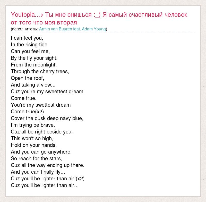 Главная→Исполнители→Armin van Buuren feat. Adam Young→Youtopia...♪ Ты мне снишься :_) Я самый счастливый человек от того что моя втора