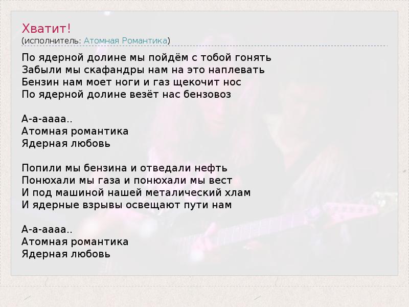 По ядерной долине мы пойдём с тобой гонять Забыли мы скафандры нам на это наплевать Бензин нам моет ноги и газ щекочит нос По ядерной долине везёт нас бензовоз А-а-аааа.. Атомная романтика Ядерная любовь Попили мы бензина и отведали нефть Понюхали мы газа и понюхали мы вест И под машиной нашей металический хлам И ядерные взрывы освещают пути нам А-а-аааа.. Атомная романтика Ядерная любовь