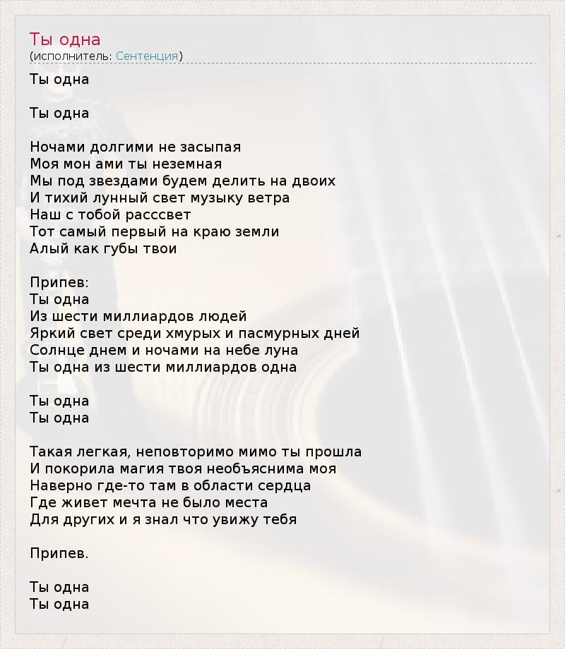 Ты одна Ты одна Ночами долгими не засыпая Моя мон ами ты неземная Мы под звездами будем делить на двоих И тихий лунный свет музыку ветра Наш с тобой расссвет Тот самый первый на краю земли Алый как губы твои Припев: Ты одна Из шести миллиардов людей Яркий свет среди хмурых и пасмурных дней Солнце днем и ночами на небе луна Ты одна из шести миллиардов одна Ты одна Ты одна Такая легкая, неповторимо мимо ты прошла И покорила магия твоя необъяснима моя Наверно где-то там в области сердца Где живет мечта не было места Для других и я знал что увижу тебя Припев. Ты одна Ты одна