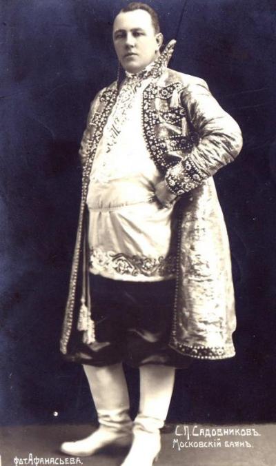 Семен Павлович Садовников - певец, автор песен начала 20-го века. И вот на сцену, встреченный аплодисментами, вышел владелец Говорушки — «Сеня Садовников», как звала его вся Москва. На нем был кафтан, весь зашитый камнями, с высоким воротом, глубокая шелковая рубаха, подпоясанная шелковым же голубым шнурком, красные высокие сафьяновые сапоги — словом, какая-то амальгама из боярского... продолжение