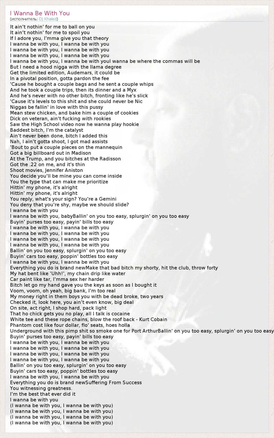 It ain't nothin' for me to ball on you It ain't nothin' for me to spoil you If I adore you, I'mma give you that theory I wanna be with you, I wanna be with you I wanna be with you, I wanna be with you I wanna be with you, I wanna be with you I wanna be with you, I wanna be with youI wanna be where the commas will be But I need a hood nigga with the llama degree Get the limited edition, Audemars, it could be In a pivotal position, gotta pardon the fee 'Cause he bought a couple bags and he sent a couple whips And he took a couple trips, then its dinner and a Myx And he's never with no other bitch, fronting like he's slick 'Cause it's levels to this shit and she could never be Nic Niggas be fallin' in love with this pussy Mean stew chicken, and bake him a couple of cookies Dick on veteran, ain't fucking with rookies Saw the High School video now he wanna play hookie Baddest bitch, I'm the catalyst Ain't never been done, bitch I added this Nah, I ain't gotta shoot, I got mad assists 'Bout to put a couple pieces on the mannequin Got a big billboard out in Madison At the Trump, and you bitches at the Radisson Got the .22 on me, and it's thin Shoot movies, Jennifer Aniston You decide you'll be mine you can come inside You the type that can make me prioritize Hittin' my phone, it's alright Hittin' my phone, it's alright You reply, what's your sign? You're a Gemini You deny that you're shy, maybe we should slide? I wanna be with you I wanna be with you, babyBallin' on you too easy, splurgin' on you too easy Buyin' purses too easy, payin' bills too easy I wanna be with you, I wanna be with you I wanna be with you, I wanna be with you I wanna be with you, I wanna be with you I wanna be with you, I wanna be with you Ballin' on you too easy, splurgin' on you too easy Buyin' cars too easy, poppin' bottles too easy I wanna be with you, I wanna be with you Everything you do is brand newMake that bad bitch my shorty, hit the club, throw forty My hat bent like 'Uhh!', my chain drip like water Car paint like tar, I'mma sex her harder Bitch let go my hand gave you the keys as soon as I bought it Voom, voom, oh yeah, big bank, I'm too real My money right in them boys you with be dead broke, two years Checked it, look here, you ain't even know, big deal On site, act right, I shop hard, pack light That ho chick gets you no play, all I talk is cocaine White tee and these rope chains, blow the roof back - Kurt Cobain Phantom cost like four dollar, flo' seats, hoes holla Underground with this pimp shit so smoke one for Port ArthurBallin' on you too easy, splurgin' on you too easy Buyin' purses too easy, payin' bills too easy I wanna be with you, I wanna be with you I wanna be with you, I wanna be with you I wanna be with you, I wanna be with you I wanna be with you, I wanna be with you Ballin' on you too easy, splurgin' on you too easy Buyin' cars too easy, poppin' bottles too easy I wanna be with you, I wanna be with you Everything you do is brand newSuffering From Success You witnessing greatness. I'm the best that ever did it I wanna be with you (I wanna be with you, I wanna be with you) (I wanna be with you, I wanna be with you) (I wanna be with you, I wanna be with you) (I wanna be with you, I wanna be with you)