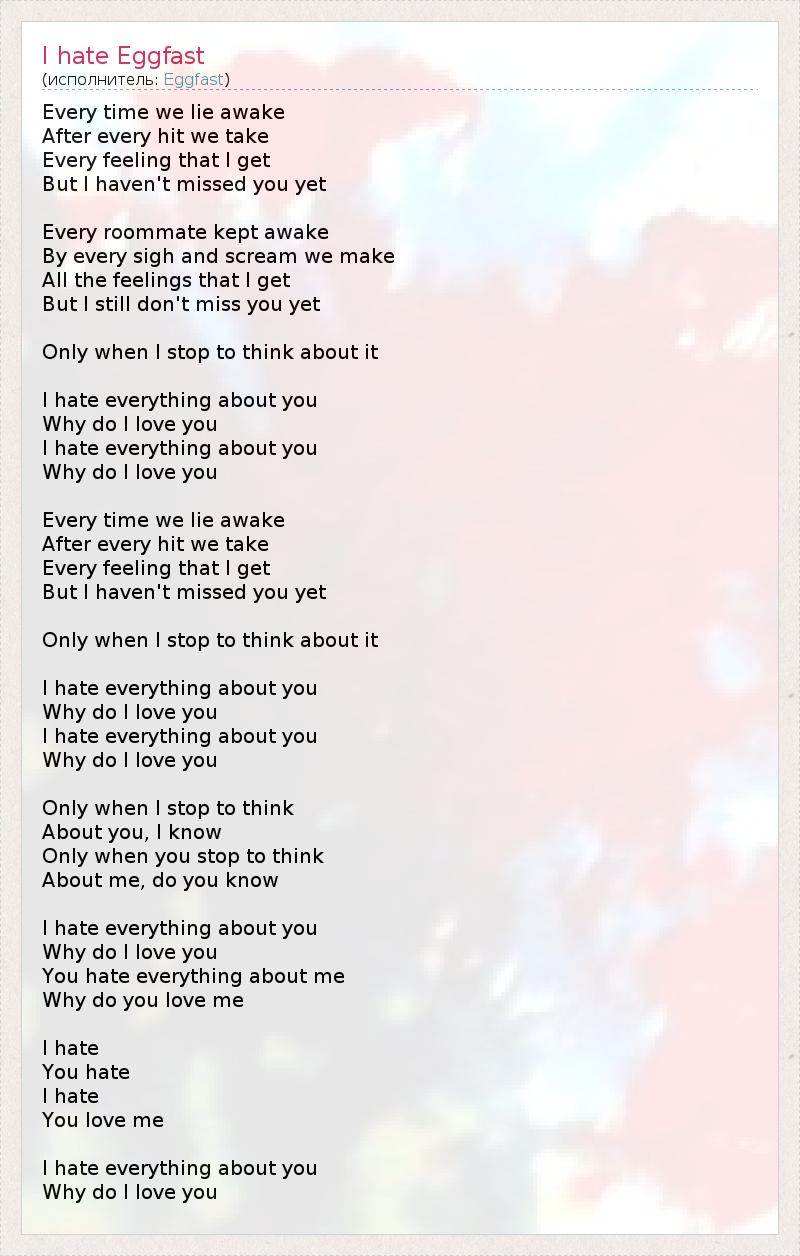 Каждый раз, когда мы лежим рядом После очередного секса, Я испытываю всевозможные ощущения, Но пока по тебе не скучаю. Соседи по комнате не могут уснуть От наших охов и вздохов. Я испытываю всевозможные ощущения, Но всё равно пока по тебе не скучаю. Только когда останавливаюсь, чтобы подумать об этом... Я ненавижу в тебе абсолютно всё, Так почему я люблю тебя? Я ненавижу в тебе абсолютно всё, Так почему я люблю тебя? Каждый раз, когда мы лежим рядом После очередного секса, Я испытываю всевозможные ощущения, Но пока по тебе не скучаю. Только когда останавливаюсь, чтобы подумать об этом... Я ненавижу в тебе абсолютно всё, Так почему я люблю тебя? Я ненавижу в тебе абсолютно всё, Так почему я люблю тебя? Только когда я останавливаюсь, чтобы подумать О тебе, я понимаю... Только когда ты останавливаешься, чтобы подумать Обо мне... Ты знаешь? Я ненавижу в тебе абсолютно всё, Так почему я люблю тебя? Ты ненавидишь во мне абсолютно всё, Так почему ты любишь меня? Я ненавижу... Ты ненавидишь... Я ненавижу... Ты любишь меня... Я ненавижу в тебе абсолютно всё, Так почему я люблю тебя?