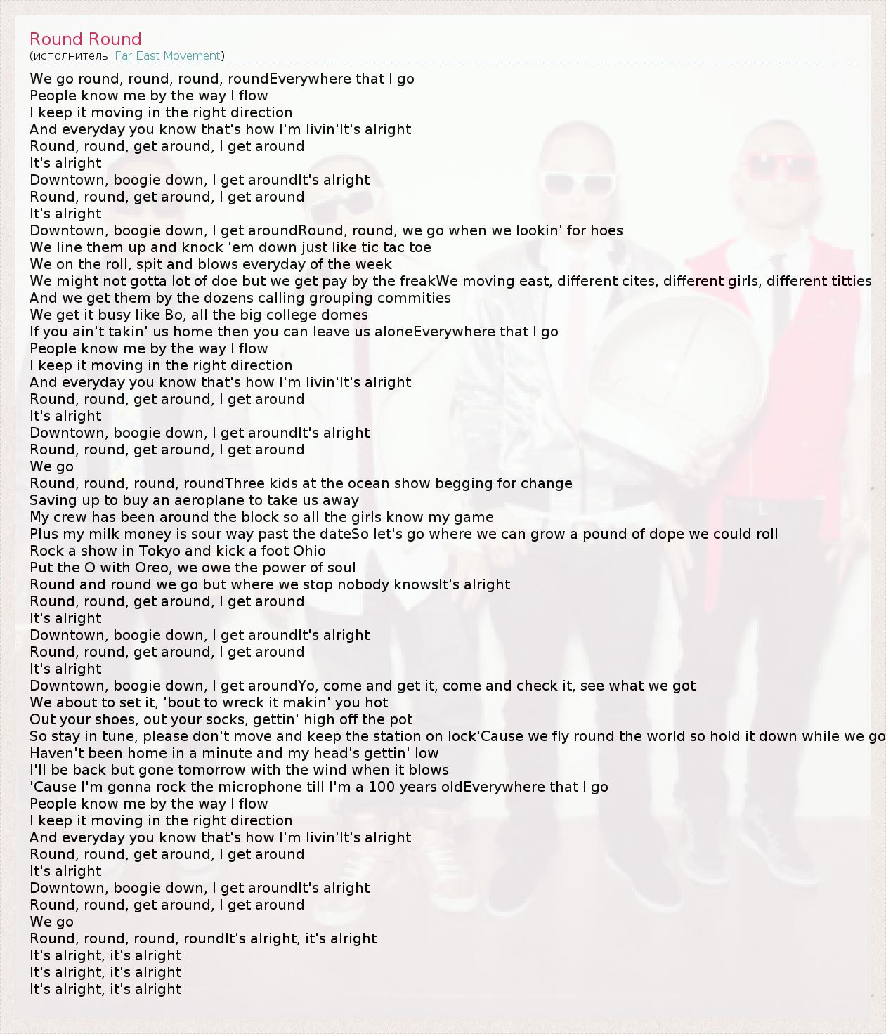 We go round, round, round, roundEverywhere that I go People know me by the way I flow I keep it moving in the right direction And everyday you know that's how I'm livin'It's alright Round, round, get around, I get around It's alright Downtown, boogie down, I get aroundIt's alright Round, round, get around, I get around It's alright Downtown, boogie down, I get aroundRound, round, we go when we lookin' for hoes We line them up and knock 'em down just like tic tac toe We on the roll, spit and blows everyday of the week We might not gotta lot of doe but we get pay by the freakWe moving east, different cites, different girls, different titties And we get them by the dozens calling grouping commities We get it busy like Bo, all the big college domes If you ain't takin' us home then you can leave us aloneEverywhere that I go People know me by the way I flow I keep it moving in the right direction And everyday you know that's how I'm livin'It's alright Round, round, get around, I get around It's alright Downtown, boogie down, I get aroundIt's alright Round, round, get around, I get around We go Round, round, round, roundThree kids at the ocean show begging for change Saving up to buy an aeroplane to take us away My crew has been around the block so all the girls know my game Plus my milk money is sour way past the dateSo let's go where we can grow a pound of dope we could roll Rock a show in Tokyo and kick a foot Ohio Put the O with Oreo, we owe the power of soul Round and round we go but where we stop nobody knowsIt's alright Round, round, get around, I get around It's alright Downtown, boogie down, I get aroundIt's alright Round, round, get around, I get around It's alright Downtown, boogie down, I get aroundYo, come and get it, come and check it, see what we got We about to set it, 'bout to wreck it makin' you hot Out your shoes, out your socks, gettin' high off the pot So stay in tune, please don't move and keep the station on lock'Cause we fly round the world so hold it down while we go Haven't been home in a minute and my head's gettin' low I'll be back but gone tomorrow with the wind when it blows 'Cause I'm gonna rock the microphone till I'm a 100 years oldEverywhere that I go People know me by the way I flow I keep it moving in the right direction And everyday you know that's how I'm livin'It's alright Round, round, get around, I get around It's alright Downtown, boogie down, I get aroundIt's alright Round, round, get around, I get around We go Round, round, round, roundIt's alright, it's alright It's alright, it's alright It's alright, it's alright It's alright, it's alright