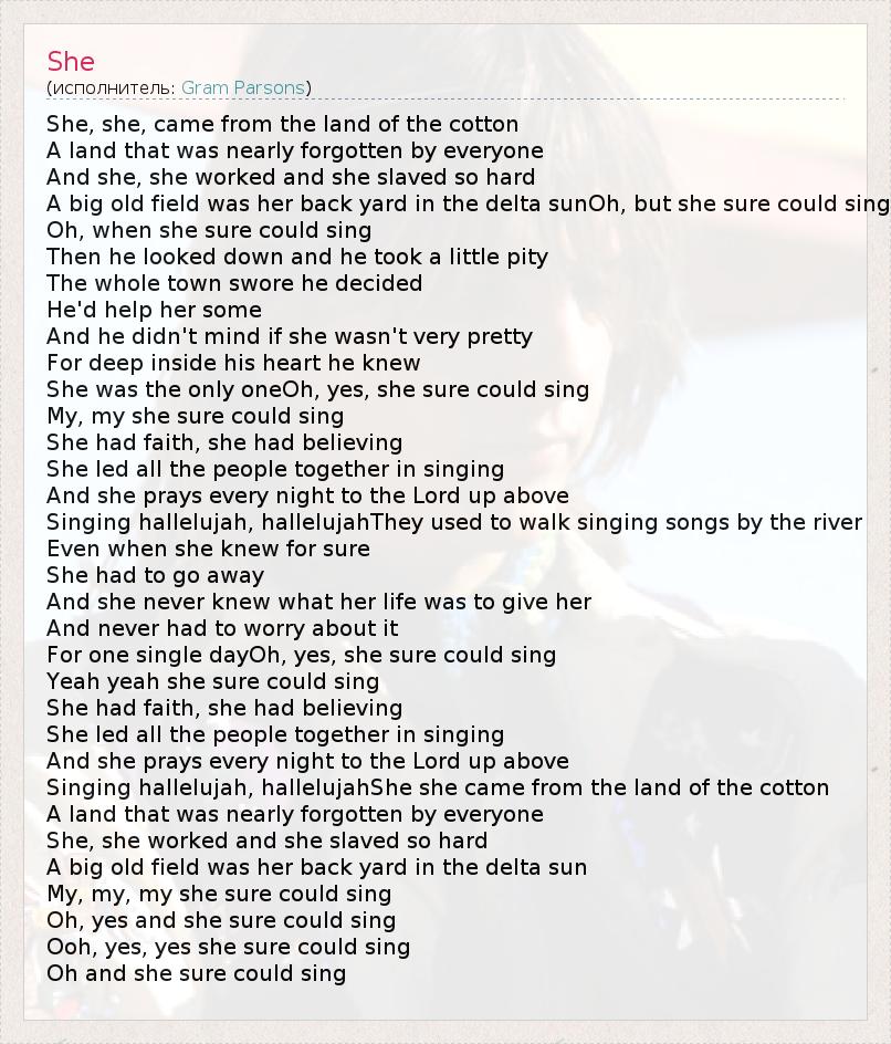 Singing hallelujah, hallelujahShe she came from the land of the cotton