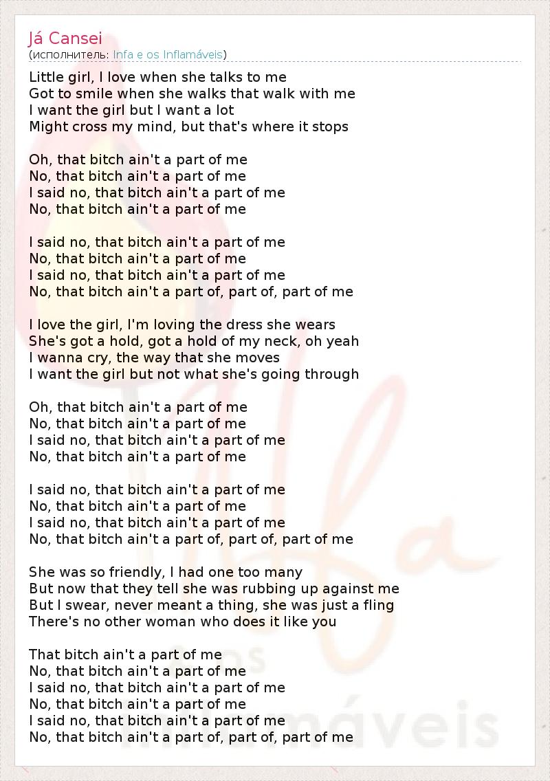 Маленькая девочка, я люблю, когда она говорит со мной. Улыбаюсь тому, что она гуляет вместе со мной. Я хочу девочку, но я хочу много. Такая мысль может промелькнуть в голове, но что-то её останавливает. Эта с*ка не является частью меня, Нет, эта с*ка не является частью меня. Я сказал: нет, эта с*ка не является частью меня, Нет, эта с*ка не является частью меня. Я сказал: нет, эта с*ка не является частью меня, Нет, эта с*ка не является частью меня. Я сказал: нет, эта с*ка не является частью меня, Нет, эта су*а не является часть-часть-частью меня. Я люблю эту девушку, мне нравится платье, что надето на ней. Она мной завладела, села мне на шею, Я хочу кричать: она так двигается… Я ее хочу, но не хочу того, что испытывает она. Эта с*ка не является частью меня, Нет, эта с*ка не является частью меня. Я сказал: нет, эта с*ка не является частью меня, Нет, эта с*ка не является частью меня. Я сказал: нет, эта с*ка не является частью меня, Нет, эта с*ка не является частью меня. Я сказал: нет, эта с*ка не является частью меня, Нет, эта су*а не является часть-часть-частью меня. Она была так дружелюбна, я хватил лишнего. Теперь говорят, что она ластилась ко мне, Но клянусь, это никогда не имело значения, она была просто развлечением, Но ни одна женщина не делает это так, как ты. Эта с*ка не является частью меня, Нет, эта с*ка не является частью меня. Я сказал: нет, эта с*ка не является частью меня, Нет, эта с*ка не является частью меня. Я сказал: нет, эта с*ка не является частью меня, Нет, эта су*а не является часть-часть-частью меня.