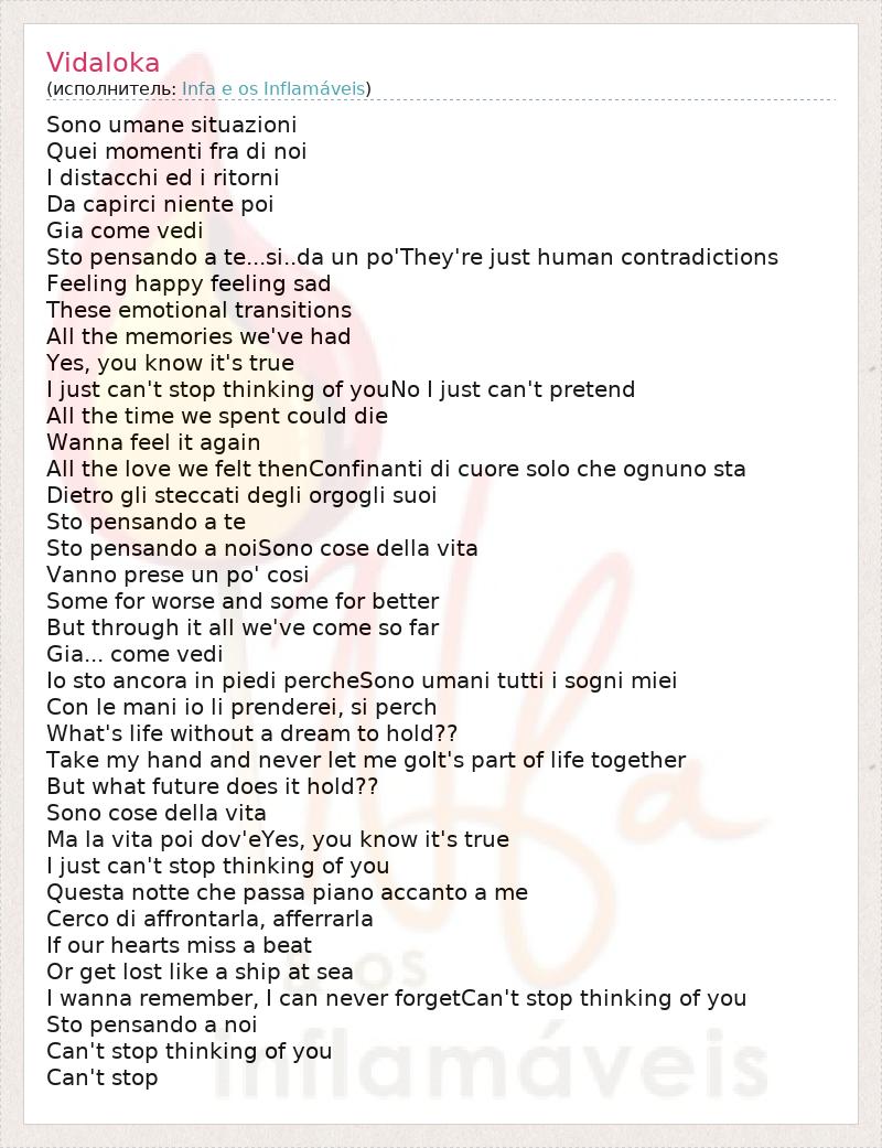 Sono umane situazioni Quei momenti fra di noi I distacchi ed i ritorni Da capirci niente poi Gia come vedi Sto pensando a te...si..da un po'They're just human contradictions Feeling happy feeling sad These emotional transitions All the memories we've had Yes, you know it's true I just can't stop thinking of youNo I just can't pretend All the time we spent could die Wanna feel it again All the love we felt thenConfinanti di cuore solo che ognuno sta Dietro gli steccati degli orgogli suoi Sto pensando a te Sto pensando a noiSono cose della vita Vanno prese un po' cosi Some for worse and some for better But through it all we've come so far Gia... come vedi Io sto ancora in piedi percheSono umani tutti i sogni miei Con le mani io li prenderei, si perch What's life without a dream to hold?? Take my hand and never let me goIt's part of life together But what future does it hold?? Sono cose della vita Ma la vita poi dov'eYes, you know it's true I just can't stop thinking of you Questa notte che passa piano accanto a me Cerco di affrontarla, afferrarla If our hearts miss a beat Or get lost like a ship at sea I wanna remember, I can never forgetCan't stop thinking of you Sto pensando a noi Can't stop thinking of you Can't stop