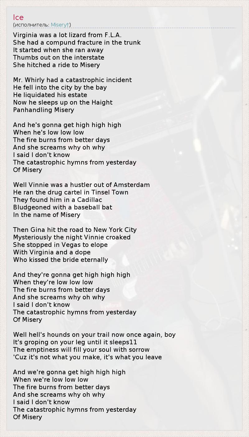 Virginia was a lot lizard from F.L.A. She had a compund fracture in the trunk It started when she ran away Thumbs out on the interstate She hitched a ride to Misery Mr. Whirly had a catastrophic incident He fell into the city by the bay He liquidated his estate Now he sleeps up on the Haight Panhandling Misery And he's gonna get high high high When he's low low low The fire burns from better days And she screams why oh why I said I don't know The catastrophic hymns from yesterday Of Misery Well Vinnie was a hustler out of Amsterdam He ran the drug cartel in Tinsel Town They found him in a Cadillac Bludgeoned with a baseball bat In the name of Misery Then Gina hit the road to New York City Mysteriously the night Vinnie croaked She stopped in Vegas to elope With Virginia and a dope Who kissed the bride eternally And they're gonna get high high high When they're low low low The fire burns from better days And she screams why oh why I said I don't know The catastrophic hymns from yesterday Of Misery Well hell's hounds on your trail now once again, boy It's groping on your leg until it sleeps11 The emptiness will fill your soul with sorrow 'Cuz it's not what you make, it's what you leave And we're gonna get high high high When we're low low low The fire burns from better days And she screams why oh why I said I don't know The catastrophic hymns from yesterday Of Misery