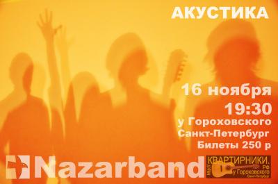 Это интересно: Nazarband (Nazar & the Band), он же Назар, он же Сергей Назаров — стихи, музыка, голос, двенадцатиструнная гитара.Сергей Назаров - российский артист и путешественник, композитор, поэт и исполнитель песен собственного сочинения. С 2005 года — фронтмен группы Nazarband, активно концертирующей в России и за её пределами.Коллектив Nazarband - один из ярких представителей современного российского... продолжение