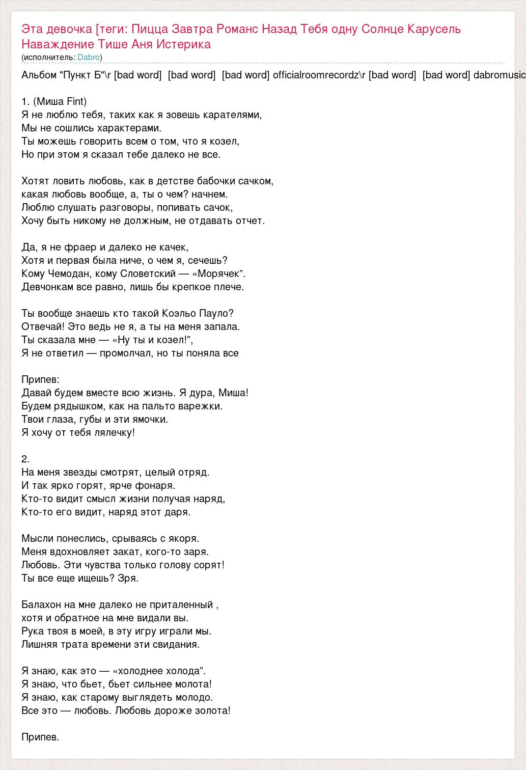Альбом "Пункт Б"\r [bad word] [bad word] [bad word] officialroomrecordz\r [bad word] [bad word] dabromusic 1. (Миша Fint) Я не люблю тебя, таких как я зовешь карателями, Мы не сошлись характерами. Ты можешь говорить всем о том, что я козел, Но при этом я сказал тебе далеко не все. Хотят ловить любовь, как в детстве бабочки сачком, какая любовь вообще, а, ты о чем? начнем. Люблю слушать разговоры, попивать сачок, Хочу быть никому не должным, не отдавать отчет. Да, я не фраер и далеко не качек, Хотя и первая была ниче, о чем я, сечешь? Кому Чемодан, кому Словетский — «Морячек”. Девчонкам все равно, лишь бы крепкое плече. Ты вообще знаешь кто такой Коэльо Пауло? Отвечай! Это ведь не я, а ты на меня запала. Ты сказала мне — «Ну ты и козел!”, Я не ответил — промолчал, но ты поняла все Припев: Давай будем вместе всю жизнь. Я дура, Миша! Будем рядышком, как на пальто варежки. Твои глаза, губы и эти ямочки. Я хочу от тебя лялечку! 2. На меня звезды смотрят, целый отряд. И так ярко горят, ярче фонаря. Кто-то видит смысл жизни получая наряд, Кто-то его видит, наряд этот даря. Мысли понеслись, срываясь с якоря. Меня вдохновляет закат, кого-то заря. Любовь. Эти чувства только голову сорят! Ты все еще ищешь? Зря. Балахон на мне далеко не приталенный , хотя и обратное на мне видали вы. Рука твоя в моей, в эту игру играли мы. Лишняя трата времени эти свидания. Я знаю, как это — «холоднее холода”. Я знаю, что бьет, бьет сильнее молота! Я знаю, как старому выглядеть молодо. Все это — любовь. Любовь дороже золота! Припев.