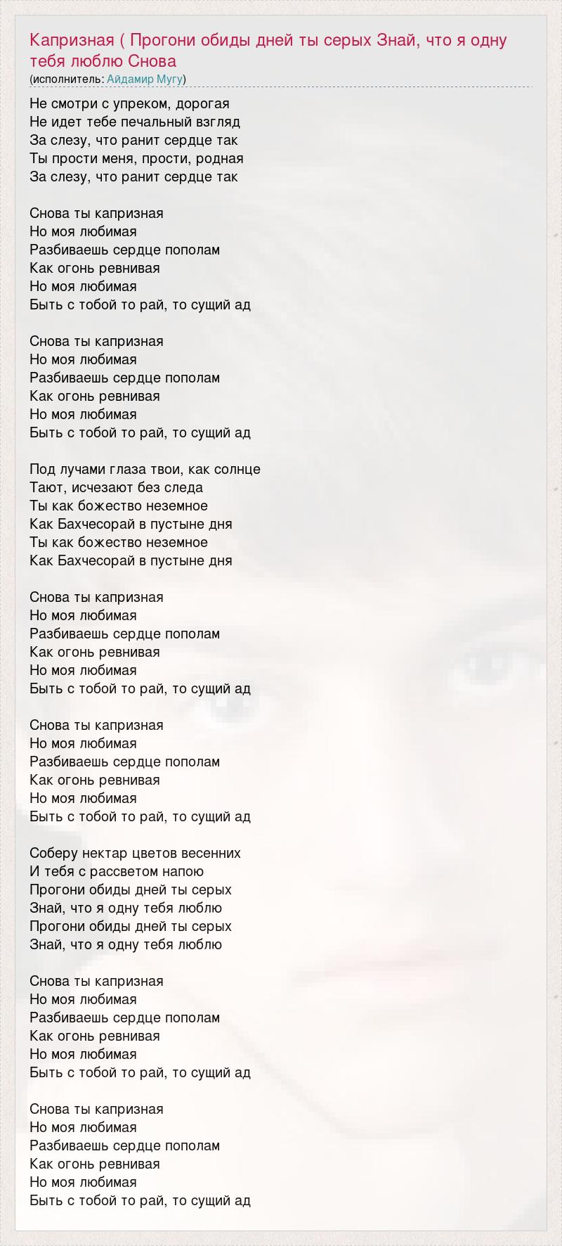 Главная→Исполнители→Айдамир Мугу→Капризная ( Прогони обиды дней ты серых Знай, что я одну тебя люблю Сно
