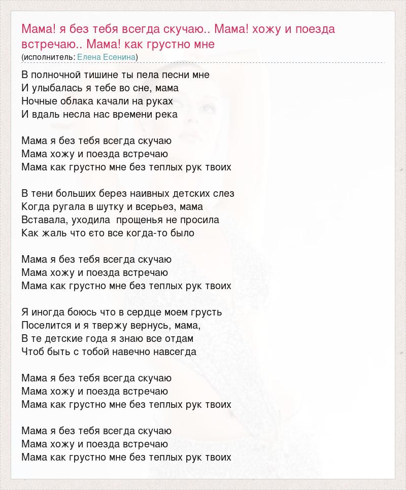 Главная→Исполнители→Елена Есенина→Мама! я без тебя всегда скучаю.. Мама! хожу и поезда встречаю.. Мама! как г