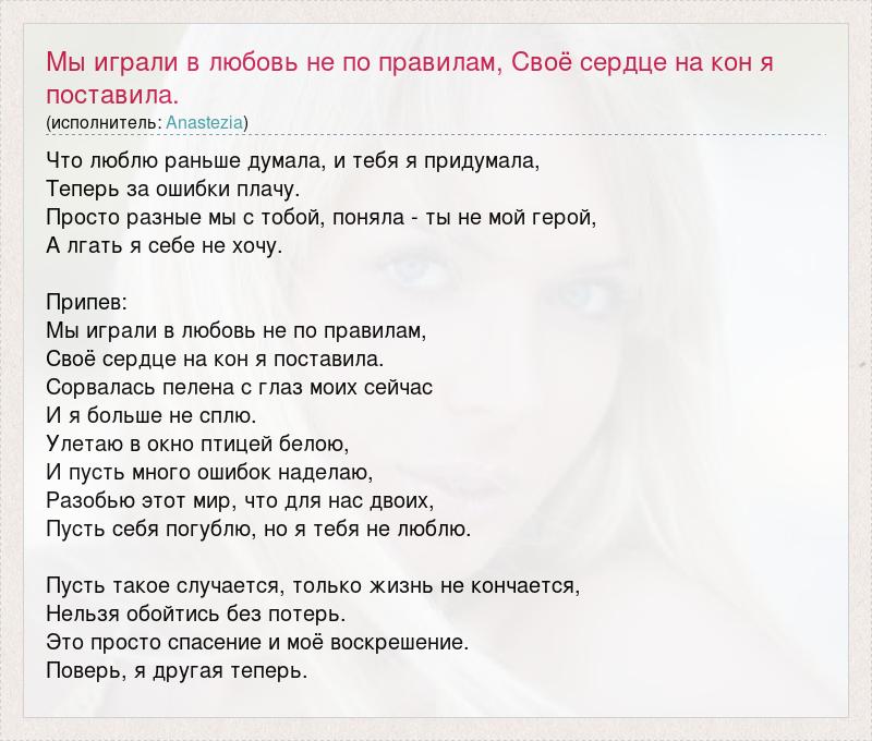 А как ты думаешь, о чем песня "Мы играли в любовь не по правилам, Своё сердце на кон я поставила." ?