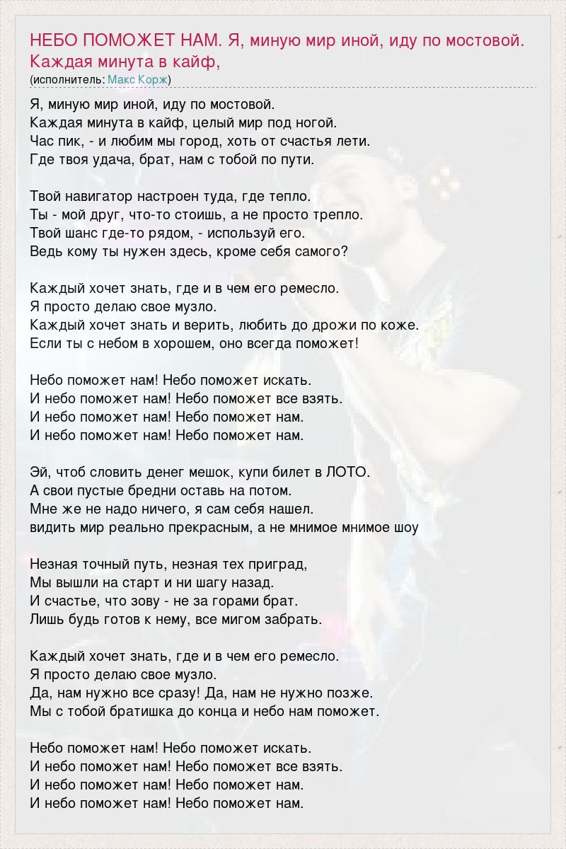 Я, миную мир иной, иду по мостовой. Каждая минута в кайф, целый мир под ногой. Час пик, - и любим мы город, хоть от счастья лети. Где твоя удача, брат, нам с тобой по пути. Твой навигатор настроен туда, где тепло. Ты - мой друг, что-то стоишь, а не просто трепло. Твой шанс где-то рядом, - используй его. Ведь кому ты нужен здесь, кроме себя самого? Каждый хочет знать, где и в чем его ремесло. Я просто делаю свое музло. Каждый хочет знать и верить, любить до дрожи по коже. Если ты с небом в хорошем, оно всегда поможет! Небо поможет нам! Небо поможет искать. И небо поможет нам! Небо поможет все взять. И небо поможет нам! Небо поможет нам. И небо поможет нам! Небо поможет нам. Эй, чтоб словить денег мешок, купи билет в ЛОТО. А свои пустые бредни оставь на потом. Мне же не надо ничего, я сам себя нашел. видить мир реально прекрасным, а не мнимое мнимое шоу Незная точный путь, незная тех приград, Мы вышли на старт и ни шагу назад. И счастье, что зову - не за горами брат. Лишь будь готов к нему, все мигом забрать. Каждый хочет знать, где и в чем его ремесло. Я просто делаю свое музло. Да, нам нужно все сразу! Да, нам не нужно позже. Мы с тобой братишка до конца и небо нам поможет. Небо поможет нам! Небо поможет искать. И небо поможет нам! Небо поможет все взять. И небо поможет нам! Небо поможет нам. И небо поможет нам! Небо поможет нам.
