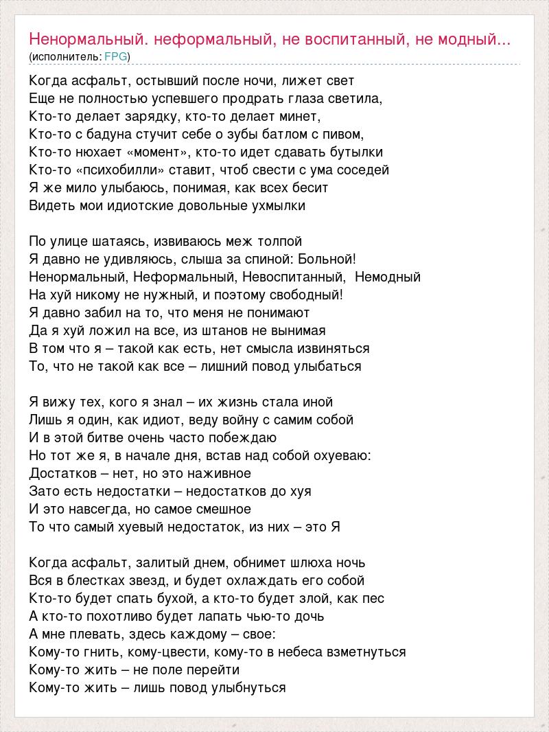 А как ты думаешь, о чем песня "Ненормальный. неформальный, не воспитанный, не модный..." ?