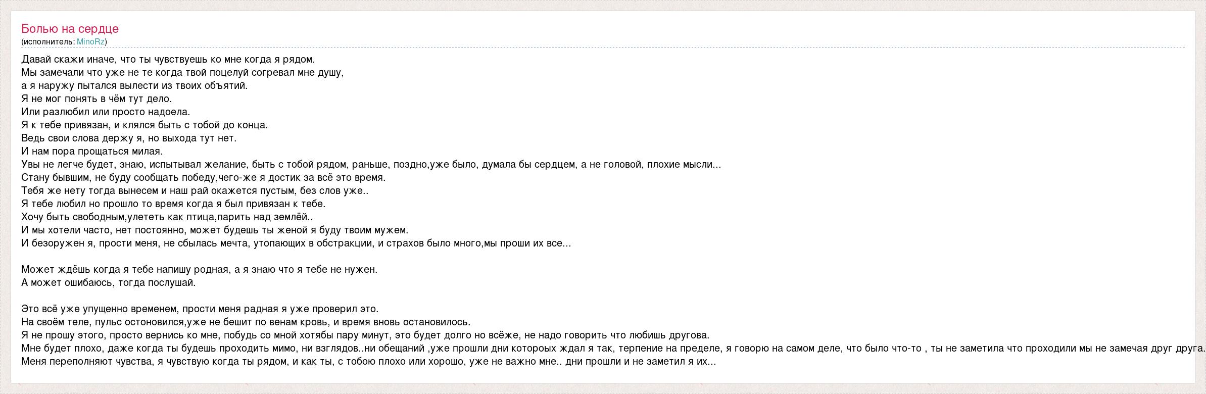 Давай скажи иначе, что ты чувствуешь ко мне когда я рядом. Мы замечали что уже не те когда твой поцелуй согревал мне душу, а я наружу пытался вылести из твоих объятий. Я не мог понять в чём тут дело. Или разлюбил или просто надоела. Я к тебе привязан, и клялся быть с тобой до конца. Ведь свои слова держу я, но выхода тут нет. И нам пора прощаться милая. Увы не легче будет, знаю, испытывал желание, быть с тобой рядом, раньше, поздно,уже было, думала бы сердцем, а не головой, плохие мысли... Стану бывшим, не буду сообщать победу,чего-же я достик за всё это время. Тебя же нету тогда вынесем и наш рай окажется пустым, без слов уже.. Я тебе любил но прошло то время когда я был привязан к тебе. Хочу быть свободным,улететь как птица,парить над землёй.. И мы хотели часто, нет постоянно, может будешь ты женой я буду твоим мужем. И безоружен я, прости меня, не сбылась мечта, утопающих в обстракции, и страхов было много,мы проши их все... Может ждёшь когда я тебе напишу родная, а я знаю что я тебе не нужен. А может ошибаюсь, тогда послушай. Это всё уже упущенно временем, прости меня радная я уже проверил это. На своём теле, пульс остоновился,уже не бешит по венам кровь, и время вновь остановилось. Я не прошу этого, просто вернись ко мне, побудь со мной хотябы пару минут, это будет долго но всёже, не надо говорить что любишь другова. Мне будет плохо, даже когда ты будешь проходить мимо, ни взглядов..ни обещаний ,уже прошли дни котороых ждал я так, терпение на пределе, я говорю на самом деле, что было что-то , ты не заметила что проходили мы не замечая друг друга. Меня переполняют чувства, я чувствую когда ты рядом, и как ты, с тобою плохо или хорошо, уже не важно мне.. дни прошли и не заметил я их...