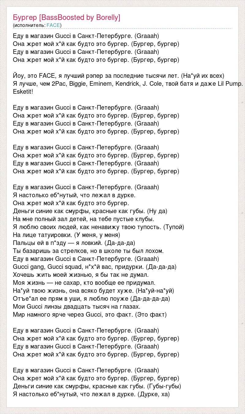 Еду в магазин Gucci в Санкт-Петербурге. (Graaah) Она жрет мой х*й как будто это бургер. (Бургер, бургер) Еду в магазин Gucci в Санкт-Петербурге. (Graaah) Она жрет мой х*й как будто это бургер. (Бургер, бургер) Йоу, это FACE, я лучший рэпер за последние тысячи лет. (На*уй их всех) Я лучше, чем 2Pac, Biggie, Eminem, Kendrick, J. Cole, твой батя и даже Lil Pump. Esketit! Еду в магазин Gucci в Санкт-Петербурге. (Graaah) Она жрет мой х*й как будто это бургер. (Бургер, бургер) Еду в магазин Gucci в Санкт-Петербурге. (Graaah) Она жрет мой х*й как будто это бургер. (Бургер, бургер) Еду в магазин Gucci в Санкт-Петербурге. (Graaah) Она жрет мой х*й как будто это бургер. (Бургер, бургер) Еду в магазин Gucci в Санкт-Петербурге. (Graaah) Она жрет мой х*й как будто это бургер. (Бургер, бургер) Еду в магазин Gucci в Санкт-Петербурге. (Graaah) Я настолько еб*нутый, что лежал в дурке. Она жрет мой х*й как будто это бургер. Деньги синие как смурфы, красные как губы. (Ну да) На мне полный зал детей, на тебе пустые клубы. Я люблю своих людей, как ненавижу твою тупость. (Тупой) На лице татуировки. (У меня, у меня) Пальцы ей в п*зду — я ловкий. (Да-да-да) Ты базаришь за стрелков, но в школе ты был лохом. Еду в магазин Gucci в Санкт-Петербурге. (Graaah) Gucci gang, Gucci squad, н*х*й вас, придурки. (Да-да-да) Хочешь жить моей жизнью, я бы так не думал. Моя жизнь — не сахар, кто вообще ее придумал. На*уй твою жизнь, она всяко будет хуже. (На*уй-на*уй) Отъе*ал ее прям в уши, я люблю поуже (Да-да-да-да) Мои Gucci линзы двадцать тысяч на глазах. Мир намного ярче через Gucci, это факт. (Это факт) Еду в магазин Gucci в Санкт-Петербурге. (Graaah) Она жрет мой х*й как будто это бургер. (Бургер, бургер) Еду в магазин Gucci в Санкт-Петербурге. (Graaah) Она жрет мой х*й как будто это бургер. (Бургер, бургер) Еду в магазин Gucci в Санкт-Петербурге. (Graaah) Она жрет мой х*й как будто это бургер. (Бургер, бургер) Деньги синие как смурфы, красные как губы. (Губы-губы) Я настолько еб*нутый, что лежал в дурке. (Дурке, ха)