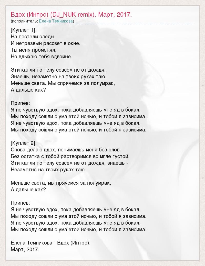 [Куплет 1]: На постели следы И нетрезвый рассвет в окне. Ты меня променял, Но вдыхаю тебя вдвойне. Эти капли по телу совсем не от дождя, Знаешь, незаметно на твоих руках таю. Меньше света. Мы спрячемся за полумрак, А дальше как? Припев: Я не чувствую вдох, пока добавляешь мне яд в бокал. Мы походу сошли с ума этой ночью, и тобой я зависима. Я не чувствую вдох, пока добавляешь мне яд в бокал. Мы походу сошли с ума этой ночью, и тобой я зависима. [Куплет 2]: Снова делаю вдох, понимаешь меня без слов. Без остатка с тобой растворимся во мгле густой. Эти капли по телу совсем не от дождя, знаешь - Незаметно на твоих руках таю. Меньше света, мы прячемся за полумрак, А дальше как? Припев: Я не чувствую вдох, пока добавляешь мне яд в бокал. Мы походу сошли с ума этой ночью, и тобой я зависима. Я не чувствую вдох, пока добавляешь мне яд в бокал. Мы походу сошли с ума этой ночью, и тобой я зависима. Елена Темникова - Вдох (Интро). Март, 2017.