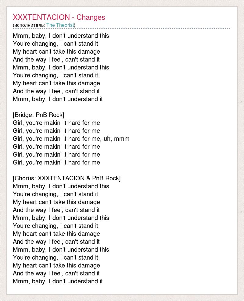 Mmm, baby, I don't understand this You're changing, I can't stand it My heart can't take this damage And the way I feel, can't stand it Mmm, baby, I don't understand this You're changing, I can't stand it My heart can't take this damage And the way I feel, can't stand it Mmm, baby, I don't understand it [Bridge: PnB Rock] Girl, you're makin' it hard for me Girl, you're makin' it hard for me Girl, you're makin' it hard for me, uh, mmm Girl, you're makin' it hard for me Girl, you're makin' it hard for me Girl, you're makin' it hard for me [Chorus: XXXTENTACION & PnB Rock] Mmm, baby, I don't understand this You're changing, I can't stand it My heart can't take this damage And the way I feel, can't stand it Mmm, baby, I don't understand this You're changing, I can't stand it My heart can't take this damage And the way I feel, can't stand it Mmm, baby, I don't understand this You're changing, I can't stand it My heart can't take this damage And the way I feel, can't stand it Mmm, baby, I don't understand it