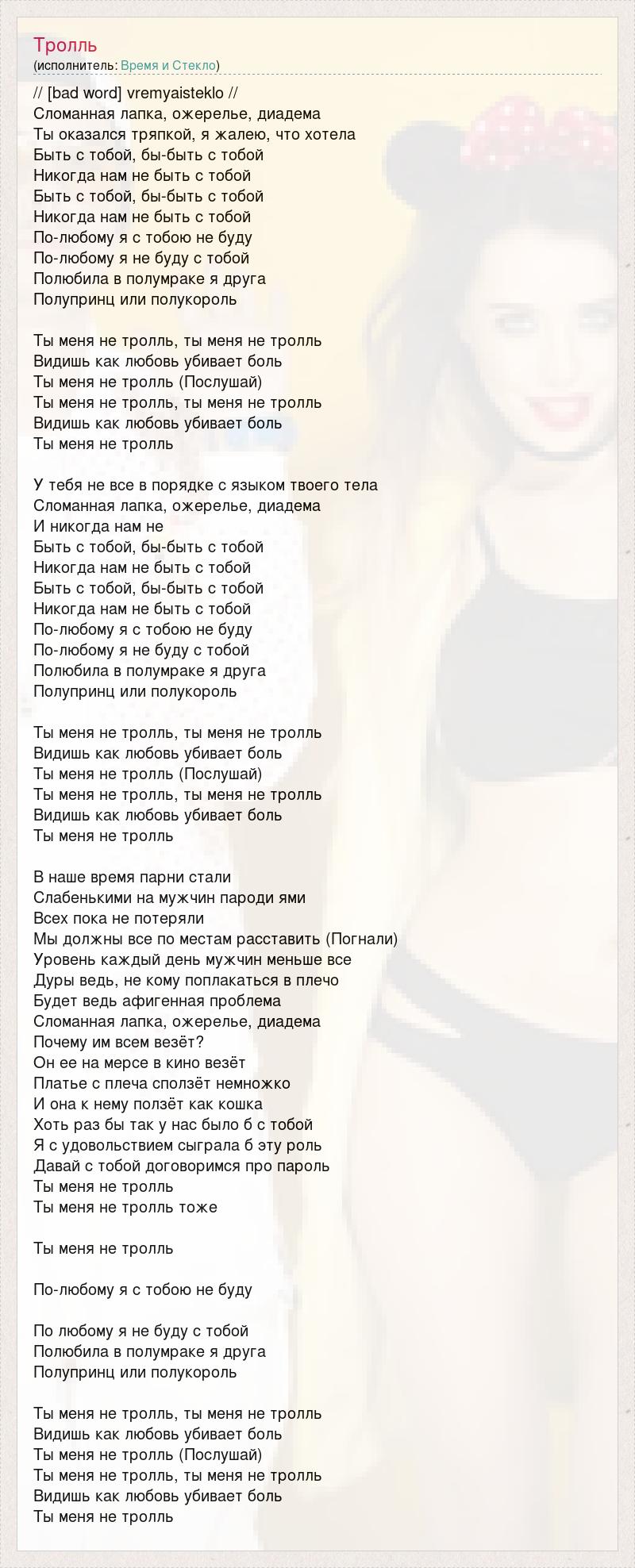 // [bad word] vremyaisteklo // Сломанная лапка, ожерелье, диадема Ты оказался тряпкой, я жалею, что хотела Быть с тобой, бы-быть с тобой Никогда нам не быть с тобой Быть с тобой, бы-быть с тобой Никогда нам не быть с тобой По-любому я с тобою не буду По-любому я не буду с тобой Полюбила в полумраке я друга Полупринц или полукороль Ты меня не тролль, ты меня не тролль Видишь как любовь убивает боль Ты меня не тролль (Послушай) Ты меня не тролль, ты меня не тролль Видишь как любовь убивает боль Ты меня не тролль У тебя не все в порядке с языком твоего тела Сломанная лапка, ожерелье, диадема И никогда нам не Быть с тобой, бы-быть с тобой Никогда нам не быть с тобой Быть с тобой, бы-быть с тобой Никогда нам не быть с тобой По-любому я с тобою не буду По-любому я не буду с тобой Полюбила в полумраке я друга Полупринц или полукороль Ты меня не тролль, ты меня не тролль Видишь как любовь убивает боль Ты меня не тролль (Послушай) Ты меня не тролль, ты меня не тролль Видишь как любовь убивает боль Ты меня не тролль В наше время парни стали Слабенькими на мужчин пароди ями Всех пока не потеряли Мы должны все по местам расставить (Погнали) Уровень каждый день мужчин меньше все Дуры ведь, не кому поплакаться в плечо Будет ведь афигенная проблема Сломанная лапка, ожерелье, диадема Почему им всем везёт? Он ее на мерсе в кино везёт Платье с плеча сползёт немножко И она к нему ползёт как кошка Хоть раз бы так у нас было б с тобой Я с удовольствием сыграла б эту роль Давай с тобой договоримся про пароль Ты меня не тролль Ты меня не тролль тоже Ты меня не тролль По-любому я с тобою не буду По любому я не буду с тобой Полюбила в полумраке я друга Полупринц или полукороль Ты меня не тролль, ты меня не тролль Видишь как любовь убивает боль Ты меня не тролль (Послушай) Ты меня не тролль, ты меня не тролль Видишь как любовь убивает боль Ты меня не тролль
