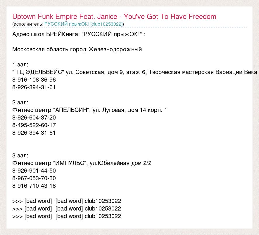 Адрес школ БРЕЙКинга: "РУССКИЙ прыжОК!" : Московская область город Железнодорожный 1 зал: " ТЦ ЭДЕЛЬВЕЙС" ул. Советская, дом 9, этаж 6, Творческая мастерская Вариации Века 8-916-108-36-96 8-926-394-31-61 2 зал: Фитнес центр "АПЕЛЬСИН", ул. Луговая, дом 14 корп. 1 8-926-604-37-20 8-495-522-60-17 8-926-394-31-61 3 зал: Фитнес центр "ИМПУЛЬС", ул.Юбилейная дом 2/2 8-926-901-44-50 8-967-053-70-30 8-916-710-43-18 >>> [bad word] [bad word] club10253022 >>> [bad word] [bad word] club10253022 >>> [bad word] [bad word] club10253022