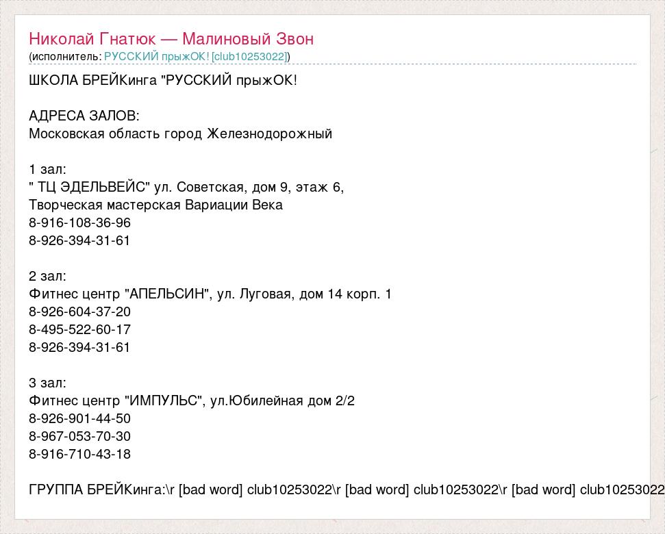 ШКОЛА БРЕЙКинга "РУССКИЙ прыжОК! АДРЕСА ЗАЛОВ: Московская область город Железнодорожный 1 зал: " ТЦ ЭДЕЛЬВЕЙС" ул. Советская, дом 9, этаж 6, Творческая мастерская Вариации Века 8-916-108-36-96 8-926-394-31-61 2 зал: Фитнес центр "АПЕЛЬСИН", ул. Луговая, дом 14 корп. 1 8-926-604-37-20 8-495-522-60-17 8-926-394-31-61 3 зал: Фитнес центр "ИМПУЛЬС", ул.Юбилейная дом 2/2 8-926-901-44-50 8-967-053-70-30 8-916-710-43-18 ГРУППА БРЕЙКинга: [bad word] club10253022 [bad word] club10253022 [bad word] club10253022