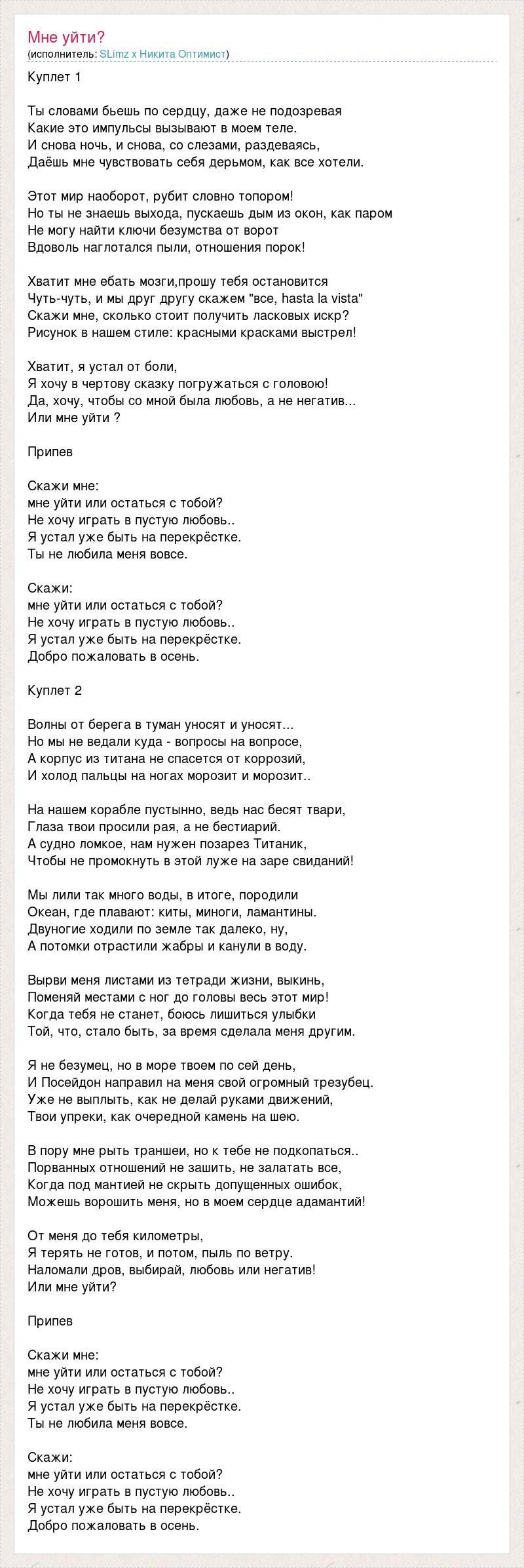 Куплет 1 Ты словами бьешь по сердцу, даже не подозревая Какие это импульсы вызывают в моем теле. И снова ночь, и снова, со слезами, раздеваясь, Даёшь мне чувствовать себя дерьмом, как все хотели. Этот мир наоборот, рубит словно топором! Но ты не знаешь выхода, пускаешь дым из окон, как паром Не могу найти ключи безумства от ворот Вдоволь наглотался пыли, отношения порок! Хватит мне ебать мозги,прошу тебя остановится Чуть-чуть, и мы друг другу скажем "все, hasta la vista" Скажи мне, сколько стоит получить ласковых искр? Рисунок в нашем стиле: красными красками выстрел! Хватит, я устал от боли, Я хочу в чертову сказку погружаться с головою! Да, хочу, чтобы со мной была любовь, а не негатив... Или мне уйти ? Припев Скажи мне: мне уйти или остаться с тобой? Не хочу играть в пустую любовь.. Я устал уже быть на перекрёстке. Ты не любила меня вовсе. Скажи: мне уйти или остаться с тобой? Не хочу играть в пустую любовь.. Я устал уже быть на перекрёстке. Добро пожаловать в осень. Куплет 2 Волны от берега в туман уносят и уносят... Но мы не ведали куда - вопросы на вопросе, А корпус из титана не спасется от коррозий, И холод пальцы на ногах морозит и морозит.. На нашем корабле пустынно, ведь нас бесят твари, Глаза твои просили рая, а не бестиарий. А судно ломкое, нам нужен позарез Титаник, Чтобы не промокнуть в этой луже на заре свиданий! Мы лили так много воды, в итоге, породили Океан, где плавают: киты, миноги, ламантины. Двуногие ходили по земле так далеко, ну, А потомки отрастили жабры и канули в воду. Вырви меня листами из тетради жизни, выкинь, Поменяй местами с ног до головы весь этот мир! Когда тебя не станет, боюсь лишиться улыбки Той, что, стало быть, за время сделала меня другим. Я не безумец, но в море твоем по сей день, И Посейдон направил на меня свой огромный трезубец. Уже не выплыть, как не делай руками движений, Твои упреки, как очередной камень на шею. В пору мне рыть траншеи, но к тебе не подкопаться.. Порванных отношений не зашить, не залатать все, Когда под мантией не скрыть допущенных ошибок, Можешь ворошить меня, но в моем сердце адамантий! От меня до тебя километры, Я терять не готов, и потом, пыль по ветру. Наломали дров, выбирай, любовь или негатив! Или мне уйти? Припев Скажи мне: мне уйти или остаться с тобой? Не хочу играть в пустую любовь.. Я устал уже быть на перекрёстке. Ты не любила меня вовсе. Скажи: мне уйти или остаться с тобой? Не хочу играть в пустую любовь.. Я устал уже быть на перекрёстке. Добро пожаловать в осень.