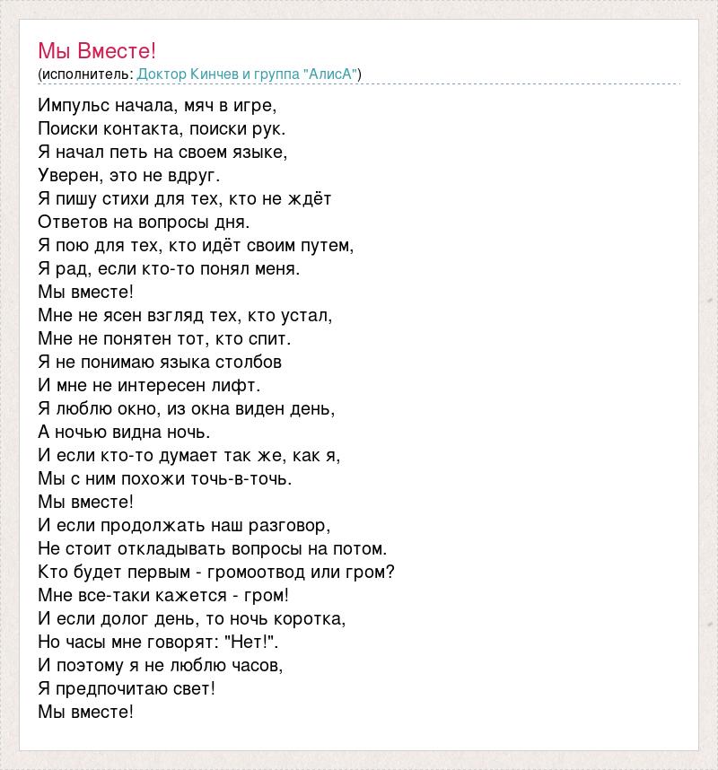 Импульс начала, мяч в игре, Поиски контакта, поиски рук. Я начал петь на своем языке, Уверен, это не вдруг. Я пишу стихи для тех, кто не ждёт Ответов на вопросы дня. Я пою для тех, кто идёт своим путем, Я рад, если кто-то понял меня. Мы вместе! Мне не ясен взгляд тех, кто устал, Мне не понятен тот, кто спит. Я не понимаю языка столбов И мне не интересен лифт. Я люблю окно, из окна виден день, А ночью видна ночь. И если кто-то думает так же, как я, Мы с ним похожи точь-в-точь. Мы вместе! И если продолжать наш разговор, Не стоит откладывать вопросы на потом. Кто будет первым - громоотвод или гром? Мне все-таки кажется - гром! И если долог день, то ночь коротка, Но часы мне говорят: "Нет!". И поэтому я не люблю часов, Я предпочитаю свет! Мы вместе!
