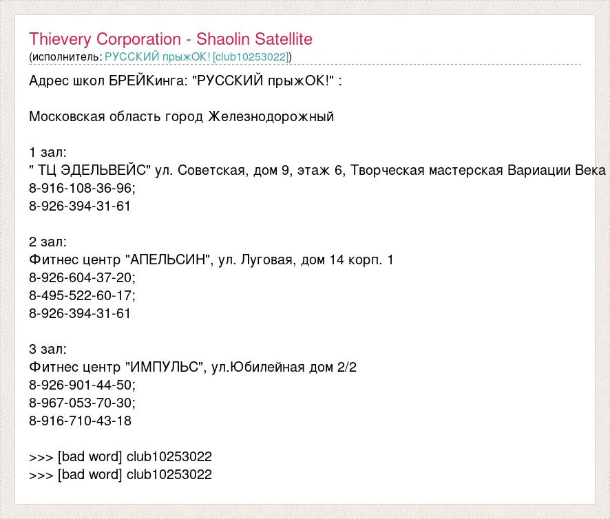 Адрес школ БРЕЙКинга: "РУССКИЙ прыжОК!" : Московская область город Железнодорожный 1 зал: " ТЦ ЭДЕЛЬВЕЙС" ул. Советская, дом 9, этаж 6, Творческая мастерская Вариации Века 8-916-108-36-96; 8-926-394-31-61 2 зал: Фитнес центр "АПЕЛЬСИН", ул. Луговая, дом 14 корп. 1 8-926-604-37-20; 8-495-522-60-17; 8-926-394-31-61 3 зал: Фитнес центр "ИМПУЛЬС", ул.Юбилейная дом 2/2 8-926-901-44-50; 8-967-053-70-30; 8-916-710-43-18 >>> [bad word] club10253022 >>> [bad word] club10253022