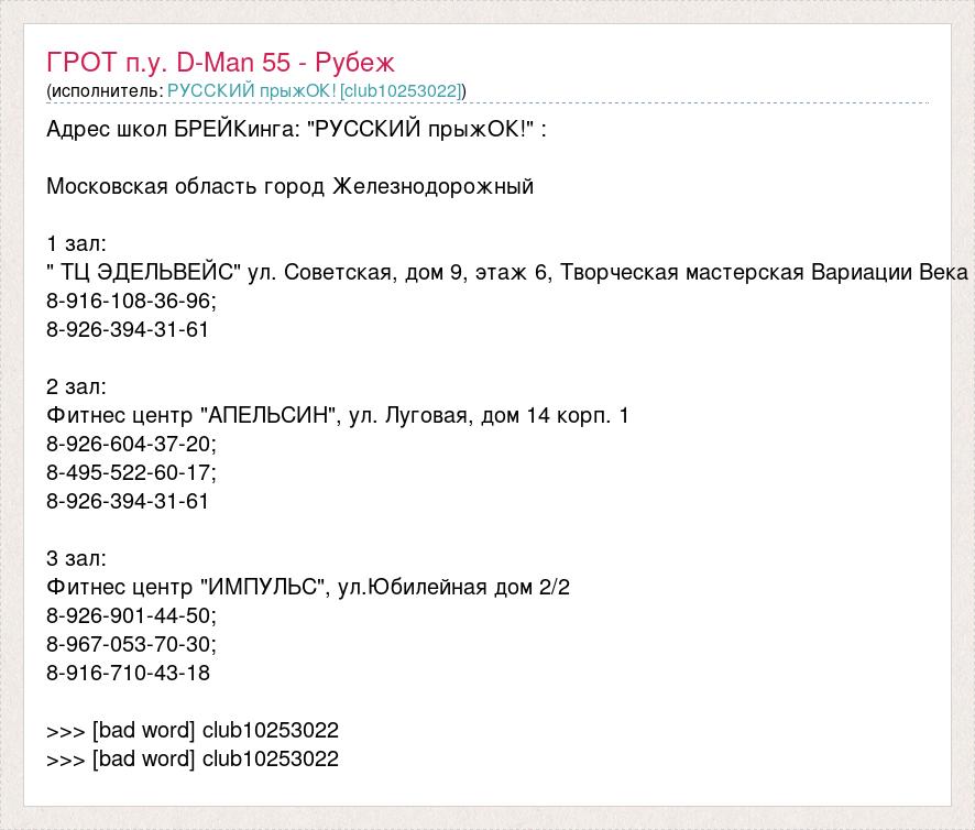 Адрес школ БРЕЙКинга: "РУССКИЙ прыжОК!" : Московская область город Железнодорожный 1 зал: " ТЦ ЭДЕЛЬВЕЙС" ул. Советская, дом 9, этаж 6, Творческая мастерская Вариации Века 8-916-108-36-96; 8-926-394-31-61 2 зал: Фитнес центр "АПЕЛЬСИН", ул. Луговая, дом 14 корп. 1 8-926-604-37-20; 8-495-522-60-17; 8-926-394-31-61 3 зал: Фитнес центр "ИМПУЛЬС", ул.Юбилейная дом 2/2 8-926-901-44-50; 8-967-053-70-30; 8-916-710-43-18 >>> [bad word] club10253022 >>> [bad word] club10253022