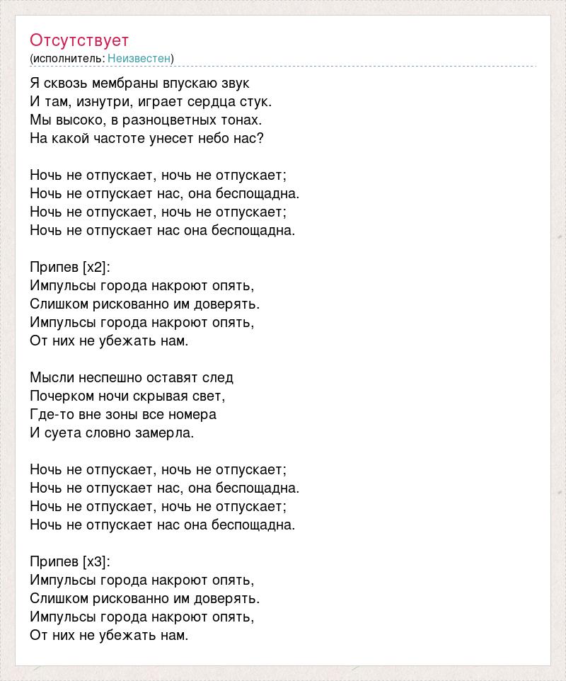 Я сквозь мембраны впускаю звук И там, изнутри, играет сердца стук. Мы высоко, в разноцветных тонах. На какой частоте унесет небо нас? Ночь не отпускает, ночь не отпускает; Ночь не отпускает нас, она беспощадна. Ночь не отпускает, ночь не отпускает; Ночь не отпускает нас она беспощадна. Припев [х2]: Импульсы города накроют опять, Слишком рискованно им доверять. Импульсы города накроют опять, От них не убежать нам. Мысли неспешно оставят след Почерком ночи скрывая свет, Где-то вне зоны все номера И суета словно замерла. Ночь не отпускает, ночь не отпускает; Ночь не отпускает нас, она беспощадна. Ночь не отпускает, ночь не отпускает; Ночь не отпускает нас она беспощадна. Припев [х3]: Импульсы города накроют опять, Слишком рискованно им доверять. Импульсы города накроют опять, От них не убежать нам.