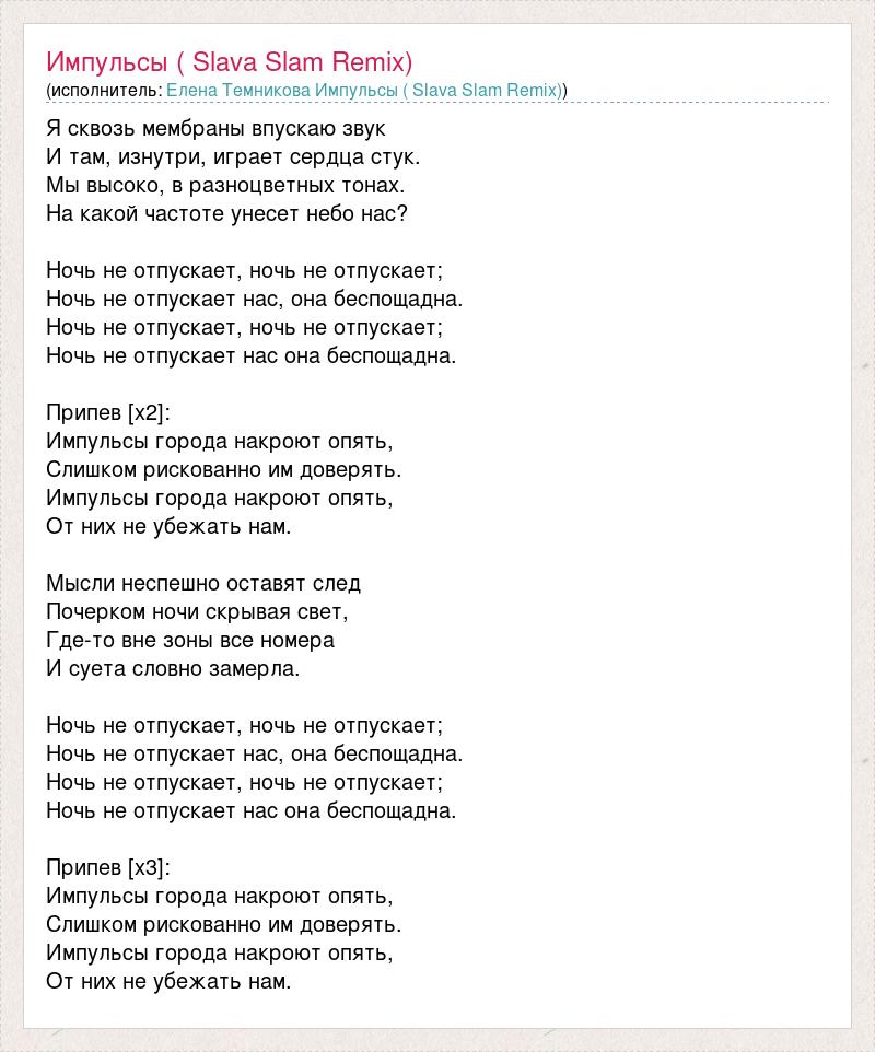 Я сквозь мембраны впускаю звук И там, изнутри, играет сердца стук. Мы высоко, в разноцветных тонах. На какой частоте унесет небо нас? Ночь не отпускает, ночь не отпускает; Ночь не отпускает нас, она беспощадна. Ночь не отпускает, ночь не отпускает; Ночь не отпускает нас она беспощадна. Припев [х2]: Импульсы города накроют опять, Слишком рискованно им доверять. Импульсы города накроют опять, От них не убежать нам. Мысли неспешно оставят след Почерком ночи скрывая свет, Где-то вне зоны все номера И суета словно замерла. Ночь не отпускает, ночь не отпускает; Ночь не отпускает нас, она беспощадна. Ночь не отпускает, ночь не отпускает; Ночь не отпускает нас она беспощадна. Припев [х3]: Импульсы города накроют опять, Слишком рискованно им доверять. Импульсы города накроют опять, От них не убежать нам.