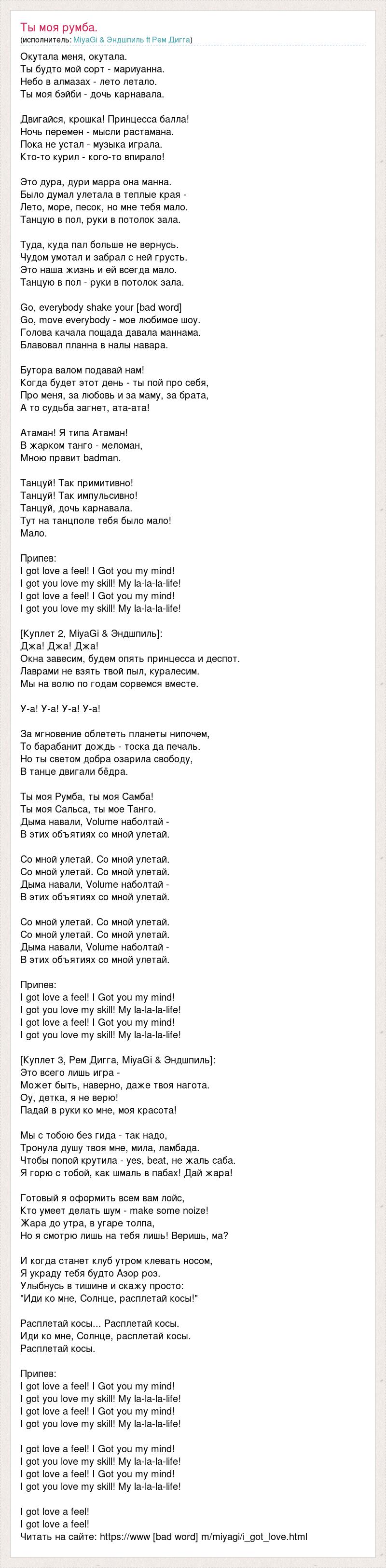 Окутала меня, окутала. Ты будто мой сорт - мариуанна. Небо в алмазах - лето летало. Ты моя бэйби - дочь карнавала. Двигайся, крошка! Принцесса балла! Ночь перемен - мысли растамана. Пока не устал - музыка играла. Кто-то курил - кого-то впирало! Это дура, дури марра она манна. Было думал улетала в теплые края - Лето, море, песок, но мне тебя мало. Танцую в пол, руки в потолок зала. Туда, куда пал больше не вернусь. Чудом умотал и забрал с ней грусть. Это наша жизнь и ей всегда мало. Танцую в пол - руки в потолок зала. Go, everybody shake your [bad word] Go, move everybody - мое любимое шоу. Голова качала пощада давала маннама. Блавовал планна в налы навара. Бутора валом подавай нам! Когда будет этот день - ты пой про себя, Про меня, за любовь и за маму, за брата, А то судьба загнет, ата-ата! Атаман! Я типа Атаман! В жарком танго - меломан, Мною правит badman. Танцуй! Так примитивно! Танцуй! Так импульсивно! Танцуй, дочь карнавала. Тут на танцполе тебя было мало! Мало. Припев: I got love a feel! I Got you my mind! I got you love my skill! My la-la-la-life! I got love a feel! I Got you my mind! I got you love my skill! My la-la-la-life! [Куплет 2, MiyaGi & Эндшпиль]: Джа! Джа! Джа! Окна завесим, будем опять принцесса и деспот. Лаврами не взять твой пыл, куралесим. Мы на волю по годам сорвемся вместе. У-а! У-а! У-а! У-а! За мгновение облететь планеты нипочем, То барабанит дождь - тоска да печаль. Но ты светом добра озарила свободу, В танце двигали бёдра. Ты моя Румба, ты моя Самба! Ты моя Сальса, ты мое Танго. Дыма навали, Volume наболтай - В этих объятиях со мной улетай. Со мной улетай. Со мной улетай. Со мной улетай. Со мной улетай. Дыма навали, Volume наболтай - В этих объятиях со мной улетай. Со мной улетай. Со мной улетай. Со мной улетай. Со мной улетай. Дыма навали, Volume наболтай - В этих объятиях со мной улетай. Припев: I got love a feel! I Got you my mind! I got you love my skill! My la-la-la-life! I got love a feel! I Got you my mind! I got you love my skill! My la-la-la-life! [Куплет 3, Рем Дигга, MiyaGi & Эндшпиль]: Это всего лишь игра - Может быть, наверно, даже твоя нагота. Оу, детка, я не верю! Падай в руки ко мне, моя красота! Мы с тобою без гида - так надо, Тронула душу твоя мне, мила, ламбада. Чтобы попой крутила - yes, beat, не жаль саба. Я горю с тобой, как шмаль в пабах! Дай жара! Готовый я оформить всем вам лойс, Кто умеет делать шум - make some noize! Жара до утра, в угаре толпа, Но я смотрю лишь на тебя лишь! Веришь, ма? И когда станет клуб утром клевать носом, Я украду тебя будто Азор роз. Улыбнусь в тишине и скажу просто: "Иди ко мне, Солнце, расплетай косы!" Расплетай косы... Расплетай косы. Иди ко мне, Солнце, расплетай косы. Расплетай косы. Припев: I got love a feel! I Got you my mind! I got you love my skill! My la-la-la-life! I got love a feel! I Got you my mind! I got you love my skill! My la-la-la-life! I got love a feel! I Got you my mind! I got you love my skill! My la-la-la-life! I got love a feel! I Got you my mind! I got you love my skill! My la-la-la-life! I got love a feel! I got love a feel! Читать на сайте: https://www [bad word] m/miyagi/i_got_love.html