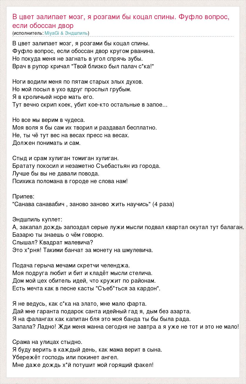 В цвет залипает мозг, я розгами бы коцал спины. Фуфло вопрос, если обоссан двор кругом рванина. Но покуда меня не загнать в угол спрячь зубы. Врач в рупор кричал "Твой близко был палач с*ка!" Ноги водили меня по пятам старых злых духов. Но мой посыл в ухо вдруг прослыл грубым. Я в кроличьей норе мать его. Тут вечно скрип коек, убит кое-кто остальные в запое... Но все мы верим в чудеса. Моя воля я бы сам их творил и раздавал бесплатно. Не, ты чё тут вес на весах пресс на весах. Должен понимать и сам. Стыд и срам хулиган томиган хулиган. Братату покосил и незаметно Съебастьян из города. Лучше бы вы не давали повода. Психика поломана в городе не слова нам! Припев: "Санава санавабич , заново заново жить научись" (4 раза) Эндшпиль куплет: А, закапал дождь запоздал серые лужи мысли подвал квартал окутал тут балаган. Базарю ты знаешь о чём говорю. Слышал? Квадрат малевича? Это х*рня! Такими банчат за монету на шмулевича. Подача герыча мечами скретчи челенджа. Моя подруга любит и бит и кладёт мысли стелича. Дом мой цех обитель идей, что кружит по районам. Есть мечта как в песне касты "Съеб*ться за кардон". Я не ведусь, как с*ка на злато, мне мало фарта. Дай мне гаранта подарок санта идейный гад я, дым без азарта. Я на фалангах как капитан бля это моя банда ты бы была рада. Запала? Ладно! Жди меня манна сегодня не завтра а я уже не тот и это не мало! Срама на улицах стыдно. Я буду верить в каждый день, как мама верит в сына. Убережёт господь или покинет ангел. Мне даже дождь х*й потушит мой горящий факел!