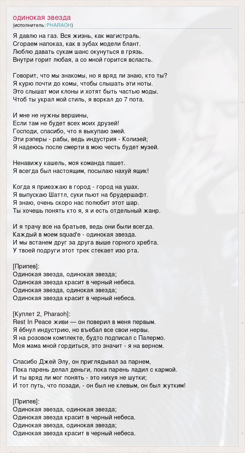Я давлю на газ. Вся жизнь, как магистраль. Сгораем напоказ, как в зубах модели блант. Люблю давать сукам шанс окунуться в грязь. Внутри горит любая, а со мной горится всласть. Говорит, что мы знакомы, но я вряд ли знаю, кто ты? Я курю почти до комы, чтобы слышать эти ноты. Это слышат мои клоны и хотят быть частью моды. Чтоб ты украл мой стиль, я воркал до 7 пота. И мне не нужны вершины, Если там не будет всех моих друзей! Господи, спасибо, что я выкупаю змей. Эти рэперы - рабы, ведь индустрия - Колизей; Я надеюсь после смерти в мою честь будет музей. Ненавижу кашель, моя команда пашет. Я всегда был настоящим, посылаю нахуй ящик! Когда я приезжаю в город - город на ушах. Я выпускаю Шаттл, суки пьют на брудершафт. Я знаю, очень скоро нас полюбит этот шар. Ты хочешь понять кто я, я и есть отдельный жанр. И я трачу все на братьев, ведь они были всегда. Каждый в моем squad'е - одинокая звезда. И мы встанем друг за друга выше горного хребта. У твоей подруги этот трек стекает изо рта. [Припев]: Одинокая звезда, одинокая звезда; Одинокая звезда красит в черный небеса. Одинокая звезда, одинокая звезда; Одинокая звезда красит в черный небеса. [Куплет 2, Pharaoh]: Rest In Peace живи — он поверил в меня первым. Я ёбнул индустрию, но въебал все свои нервы. Я на розовом комплекте, будто подписал с Палермо. Моя мама мной гордиться, это значит - я на верном. Спасибо Джей Элу, он приглядывал за парнем, Пока парень делал деньги, пока парень ладил с кармой. И ты вряд ли мог понять - это нихуя не шутки; И тот путь, что позади, - он был не клевым, он был жутким! [Припев]: Одинокая звезда, одинокая звезда; Одинокая звезда красит в черный небеса. Одинокая звезда, одинокая звезда; Одинокая звезда красит в черный небеса.