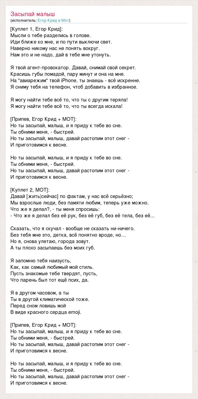 [Куплет 1, Егор Крид]: Мысли о тебе разделись в голове. Иди ближе ко мне, и по пути выключи свет. Наверно никому нас не понять вокруг. Нам это и не надо, дай в тебе мне утонуть. Я твой агент-провокатор. Давай, снимай свой секрет. Красишь губы помадой, пару минут и она на мне. На "авиарежим" твой iPhone, ты знаешь - всё искренне. Я сниму тебя на телефон, чтоб добавить в избранное. Я могу найти тебе всё то, что ты с другим теряла! Я могу найти тебе всё то, что ты всегда искала! [Припев, Егор Крид + МОТ]: Но ты засыпай, малыш, и я приду к тебе во сне. Ты обними меня, - быстрей. Но ты засыпай, малыш, давай растопим этот снег - И приготовимся к весне. Но ты засыпай, малыш, и я приду к тебе во сне. Ты обними меня, - быстрей. Но ты засыпай, малыш, давай растопим этот снег - И приготовимся к весне. [Куплет 2, МОТ]: Давай [жить|сейчас] по фактам, у нас всё серьёзно; Мы взрослые люди, без памяти любим, теперь уже можно. Что же я делал?, - ты меня спросишь: - Что же я делал без её рук, без её губ, без её тела, без её... Сказать, что я скучал - вообще не сказать ни-ничего. Без тебя мне это, детка, всё понятно вроде, но… Но я, снова улетаю, города зовут. А ты плохо засыпаешь без моих губ. Я запомню тебя наизусть, Как, как самый любимый мой стиль. Пусть знакомые тебе твердят, пусть, Что парень был тот ещё псих, да. Я в другом часовом, а ты Ты в другой климатической тоже. Перед сном ловишь мой В виде красного сердца emoji. [Припев, Егор Крид + МОТ]: Но ты засыпай, малыш, и я приду к тебе во сне. Ты обними меня, - быстрей. Но ты засыпай, малыш, давай растопим этот снег - И приготовимся к весне. Но ты засыпай, малыш, и я приду к тебе во сне. Ты обними меня, - быстрей. Но ты засыпай, малыш, давай растопим этот снег - И приготовимся к весне.