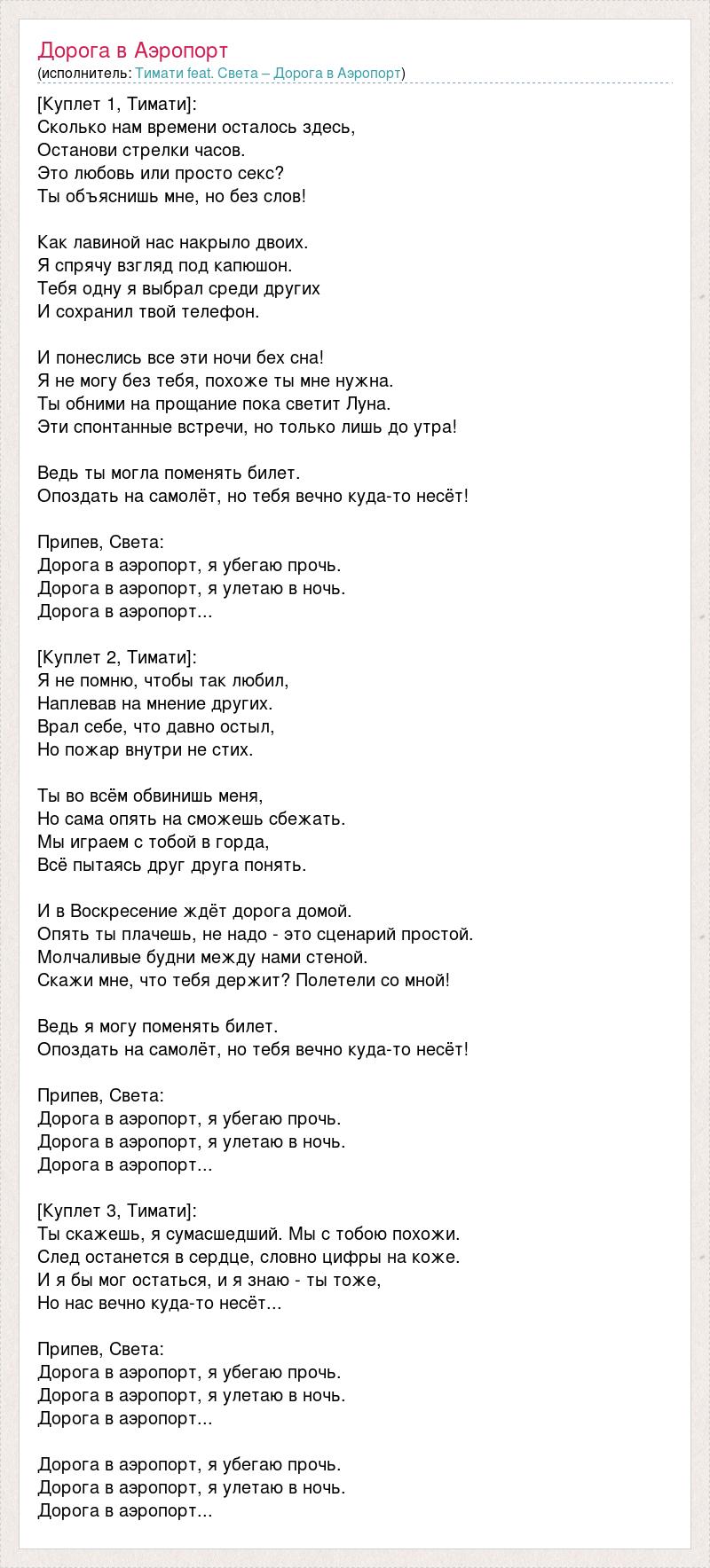 [Куплет 1, Тимати]: Сколько нам времени осталось здесь, Останови стрелки часов. Это любовь или просто секс? Ты объяснишь мне, но без слов! Как лавиной нас накрыло двоих. Я спрячу взгляд под капюшон. Тебя одну я выбрал среди других И сохранил твой телефон. И понеслись все эти ночи бех сна! Я не могу без тебя, похоже ты мне нужна. Ты обними на прощание пока светит Луна. Эти спонтанные встречи, но только лишь до утра! Ведь ты могла поменять билет. Опоздать на самолёт, но тебя вечно куда-то несёт! Припев, Света: Дорога в аэропорт, я убегаю прочь. Дорога в аэропорт, я улетаю в ночь. Дорога в аэропорт... [Куплет 2, Тимати]: Я не помню, чтобы так любил, Наплевав на мнение других. Врал себе, что давно остыл, Но пожар внутри не стих. Ты во всём обвинишь меня, Но сама опять на сможешь сбежать. Мы играем с тобой в горда, Всё пытаясь друг друга понять. И в Воскресение ждёт дорога домой. Опять ты плачешь, не надо - это сценарий простой. Молчаливые будни между нами стеной. Скажи мне, что тебя держит? Полетели со мной! Ведь я могу поменять билет. Опоздать на самолёт, но тебя вечно куда-то несёт! Припев, Света: Дорога в аэропорт, я убегаю прочь. Дорога в аэропорт, я улетаю в ночь. Дорога в аэропорт... [Куплет 3, Тимати]: Ты скажешь, я сумасшедший. Мы с тобою похожи. След останется в сердце, словно цифры на коже. И я бы мог остаться, и я знаю - ты тоже, Но нас вечно куда-то несёт... Припев, Света: Дорога в аэропорт, я убегаю прочь. Дорога в аэропорт, я улетаю в ночь. Дорога в аэропорт... Дорога в аэропорт, я убегаю прочь. Дорога в аэропорт, я улетаю в ночь. Дорога в аэропорт...