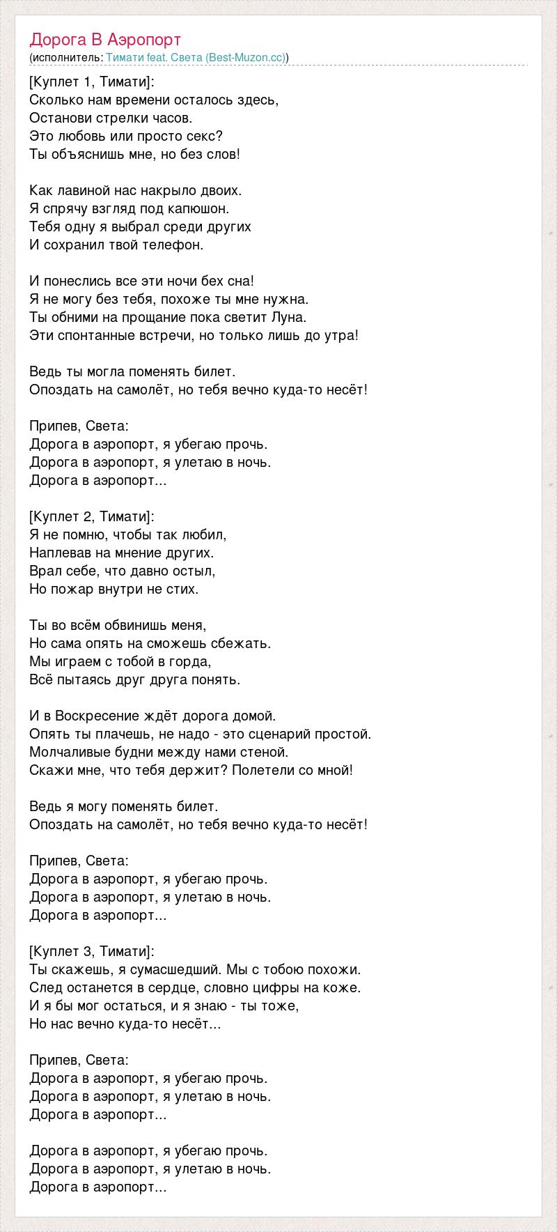 [Куплет 1, Тимати]: Сколько нам времени осталось здесь, Останови стрелки часов. Это любовь или просто секс? Ты объяснишь мне, но без слов! Как лавиной нас накрыло двоих. Я спрячу взгляд под капюшон. Тебя одну я выбрал среди других И сохранил твой телефон. И понеслись все эти ночи бех сна! Я не могу без тебя, похоже ты мне нужна. Ты обними на прощание пока светит Луна. Эти спонтанные встречи, но только лишь до утра! Ведь ты могла поменять билет. Опоздать на самолёт, но тебя вечно куда-то несёт! Припев, Света: Дорога в аэропорт, я убегаю прочь. Дорога в аэропорт, я улетаю в ночь. Дорога в аэропорт... [Куплет 2, Тимати]: Я не помню, чтобы так любил, Наплевав на мнение других. Врал себе, что давно остыл, Но пожар внутри не стих. Ты во всём обвинишь меня, Но сама опять на сможешь сбежать. Мы играем с тобой в горда, Всё пытаясь друг друга понять. И в Воскресение ждёт дорога домой. Опять ты плачешь, не надо - это сценарий простой. Молчаливые будни между нами стеной. Скажи мне, что тебя держит? Полетели со мной! Ведь я могу поменять билет. Опоздать на самолёт, но тебя вечно куда-то несёт! Припев, Света: Дорога в аэропорт, я убегаю прочь. Дорога в аэропорт, я улетаю в ночь. Дорога в аэропорт... [Куплет 3, Тимати]: Ты скажешь, я сумасшедший. Мы с тобою похожи. След останется в сердце, словно цифры на коже. И я бы мог остаться, и я знаю - ты тоже, Но нас вечно куда-то несёт... Припев, Света: Дорога в аэропорт, я убегаю прочь. Дорога в аэропорт, я улетаю в ночь. Дорога в аэропорт... Дорога в аэропорт, я убегаю прочь. Дорога в аэропорт, я улетаю в ночь. Дорога в аэропорт...